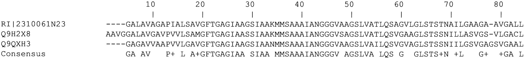 Candidate novel gene represented by clone 2310061N23 similar to the fragments of IFN-α inducible proteins in human (Q9H2X8) and hamster (Q9QXH3). (+) Conserved replacements.