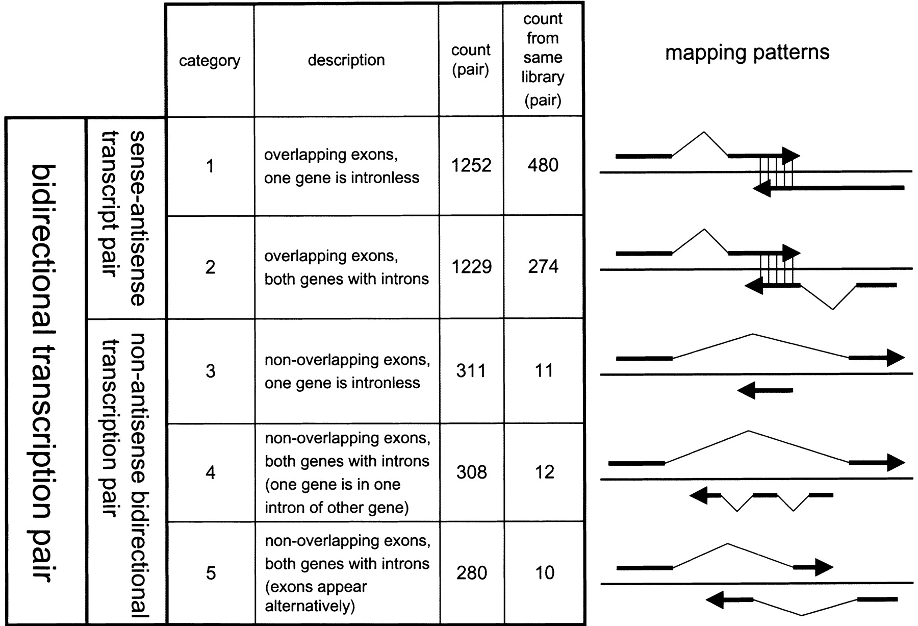 Classification of sense–antisense transcript and nonantisense bidirectional transcription pair patterns. Five categories of bidirectional transcription patterns are shown. The categories are classified according to the patterns of how the two transcripts are mapped on the genome sequences. The schematic examples from each category are shown next to each explanation. Total pair counts as well as pair counts that are from the same cDNA library sources for each category are presented.