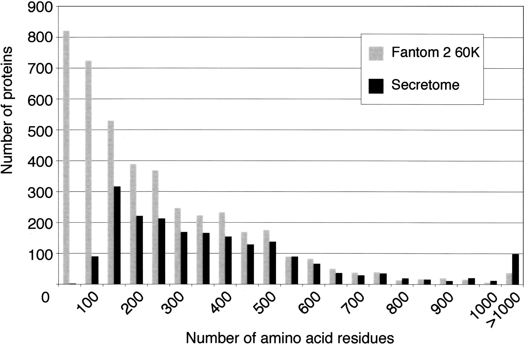 Size distribution of the proteins predicted to contain endoplasmic reticulum signal peptides within the PROCREST predicted ORFs of the RIKEN 60,770 FANTOM2 cDNA clone set and the mouse secretome. The total numbers of proteins within 50 amino acid blocks are plotted.