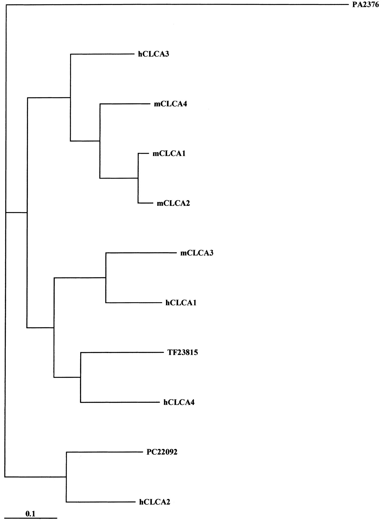 Phylogenetic tree for calcium-activated chloride channels (CLCAs). We included all the known mouse and human members of this family. PA2376 Cx43 Connexin was used as an outgroup. ClustalX was used to generate all the alignments of amino acid sequences. The following entries were analyzed: MmmCLCA1 PB18915 gp=NP_085104 ri E030034K24 chloride channel calcium activated 1; mCLCA2 gi 13447394 ref NP_085104.1 chloride channel calcium activated 2 [Mus musculus]; mCLCA3 PB6141 gp=NP_059502 chloride channel calcium activated 3; mCLCA4 gi 15822539 gb AAG23712.1 calcium-activated chloride channel CLCA4 [Mus musculus]; PC22092 ri=4732440A06 cdslen=2829 similar to CALCIUM-ACTIVATED CHLORIDE CHANNEL-2 [Homo sapiens]; TF23815 9130020L07 ORF:32..2809 Frame +2; hCLCA1 gi 20538010 ref XP_030657.4 calcium activated chloride channel 1 precursor [Homo sapiens]; hCLCA2 gi 5729769 ref NP_006527.1 calcium-activated chloride channel 2 precursor [Homo sapiens]; hCLCA3 gi 4757998 ref NP_004912.1 calcium-activated chloride channel 3 precursor [Homo sapiens]; hCLCA4 gi 20538007 ref XP_030654.4 calcium-activated chloride channel 4 [Homo sapiens]; PA2376 spid=P23242 GAP JUNCTION ALPHA-1 PROTEIN (CONNEXIN 43) (CX43).