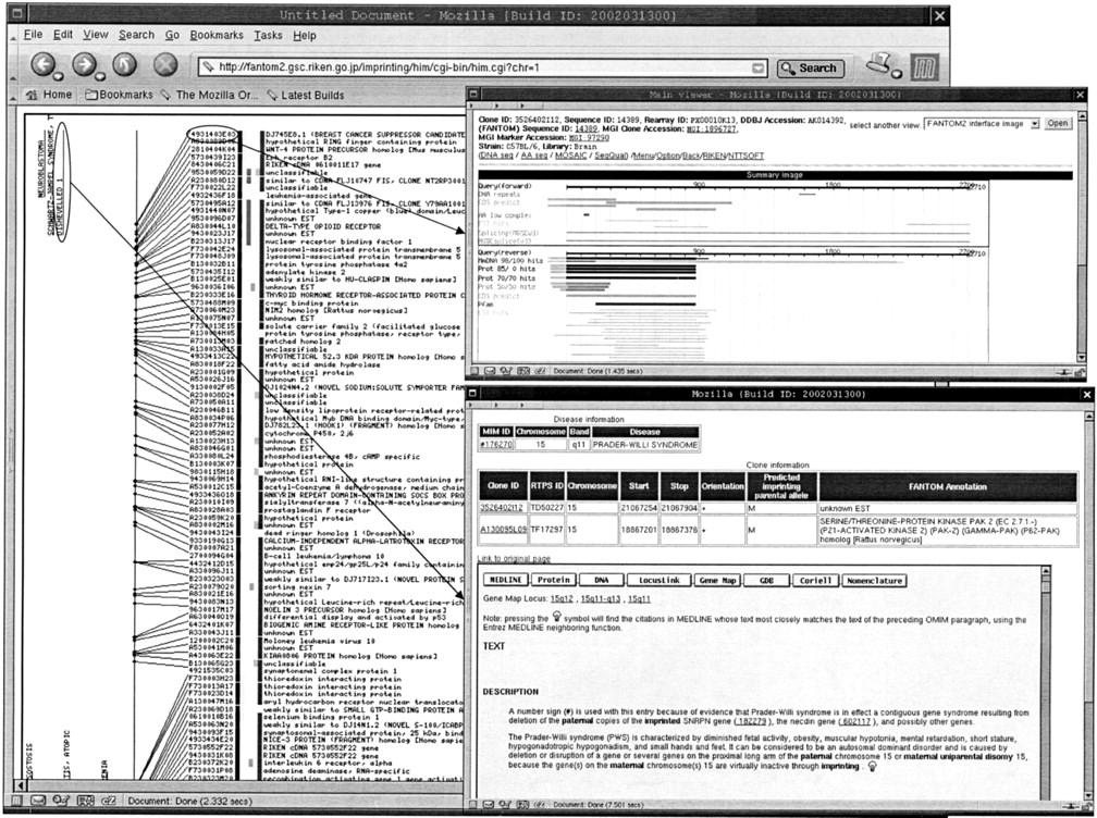 Predicted imprinted transcript map of human chromosome 1 A snap shot from the predicted imprinted transcript map (http://fantom2.gsc.riken.go.jp/imprinting/) is shown. (Left) The chromosome 15 and the mapped transcripts. On the left side of the chromosome, human imprinted gene region was shown. There is a link to the disease information (bottom, right). RIKEN clone ID that has been mapped to the chromosome has a link to the FANTOM2 viewer (top, right). There are six color boxes in between the RIKEN clone ID and the annotation as shown at left. The first color box shows whether the transcript is maternally expressed (red) or paternally expressed (blue). The second box shows whether the transcript is mapped to the human imprinted disease loci (yellow). If yes, the color box is painted in yellow. The third-fifth boxes show whether the transcript overlaps with the mouse imprint region (orange), natural antisense transcript (green), or ncRNA(blue) as shown in Figure 1(Venn diagram). The sixth box shows whether the position on human genome is confirmed by mouse human homology map (Gregory et al. 2002) (fuchsia).