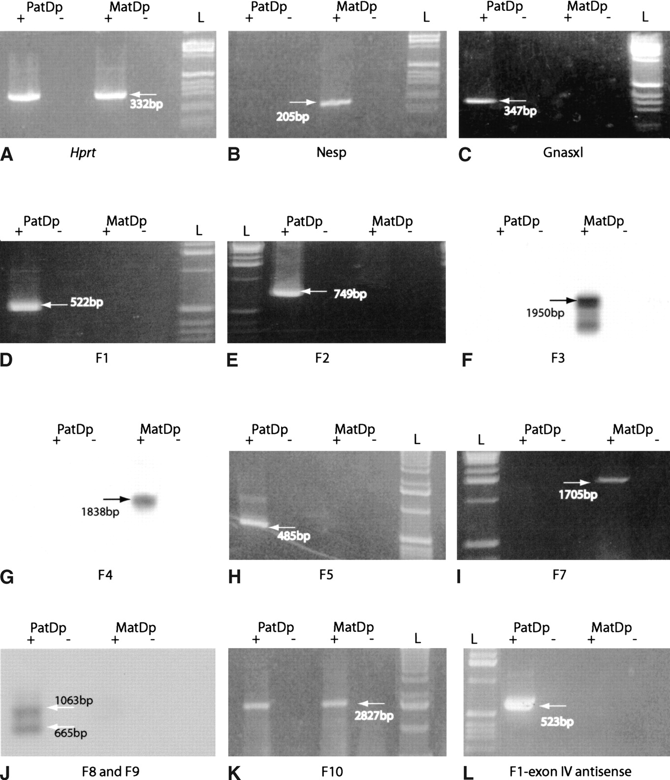 Imprinting status of FANTOM clones F1–F10. Each PCR product is sized with a -kb ladder (Invitrogen). MatDp(dist2) and PatDp(dist2) are abbreviatedto MatDp and PatDp, respectively. + and - refers to samples amplifiedin the presence (+) or absence (-) of reverse transcriptase. Oligo dT-primed cDNA was amplified with: (A) Hprt primers as an amplification control; (B) Nesp primers to confirm the MatDp(dist2) cDNA; and (C) Gnasxl primers to confirm the PatDp(dist2) cDNA. Strand-specific RT-PCR of FANTOM clones 1–10: (D) paternal expression of F1; (E) paternal expression of F2; (F) maternal expression of F3; (G) maternal expression of F4; (H) paternal expression of F5; (I) maternal expression of F7; (J) paternal expression of F8 and F9; and(K) bi-allelic expression of F10. The PCR products from F3 (F), F4 (G), F7 (I), and F8 (J) were blottedand probedas describedin Methods. (L) F1 is part of Nespas. PCR from exon IV of Nespas to F1 reveals a paternal-specific product. The products in A–C, G, H, and L were amplifiedfor 25 cycles. The products in D–F, I and J were amplifiedfor 30 cycles; the product in K was amplifiedfor 20 cycles. (L) 1-kb Ladder (Invitrogen).