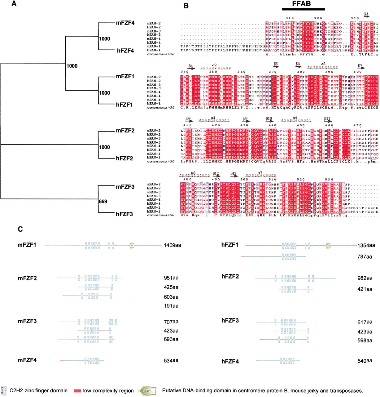 (A) Unrootedphylogeny among the Fzf family. The entire mouse and human protein sequences of the Fzf family (Table 3) were aligned and subjected to Neighbor Joining with 1000 bootstrap analysis. (B) Protein sequence alignment of the six C2H2 core zinc finger domains of the FZF proteins. The secondary structure of the six fingers is shown above the alignment; the domain consensus is shown below the alignment, the FFAB domain is indicated by the black bar. (C) Domain architecture of the mouse and human Fzf proteins. Protein structural representation was generated using Simple Modular Architecture Research Tool (SMART; http://smart.embl-heidelberg.de).