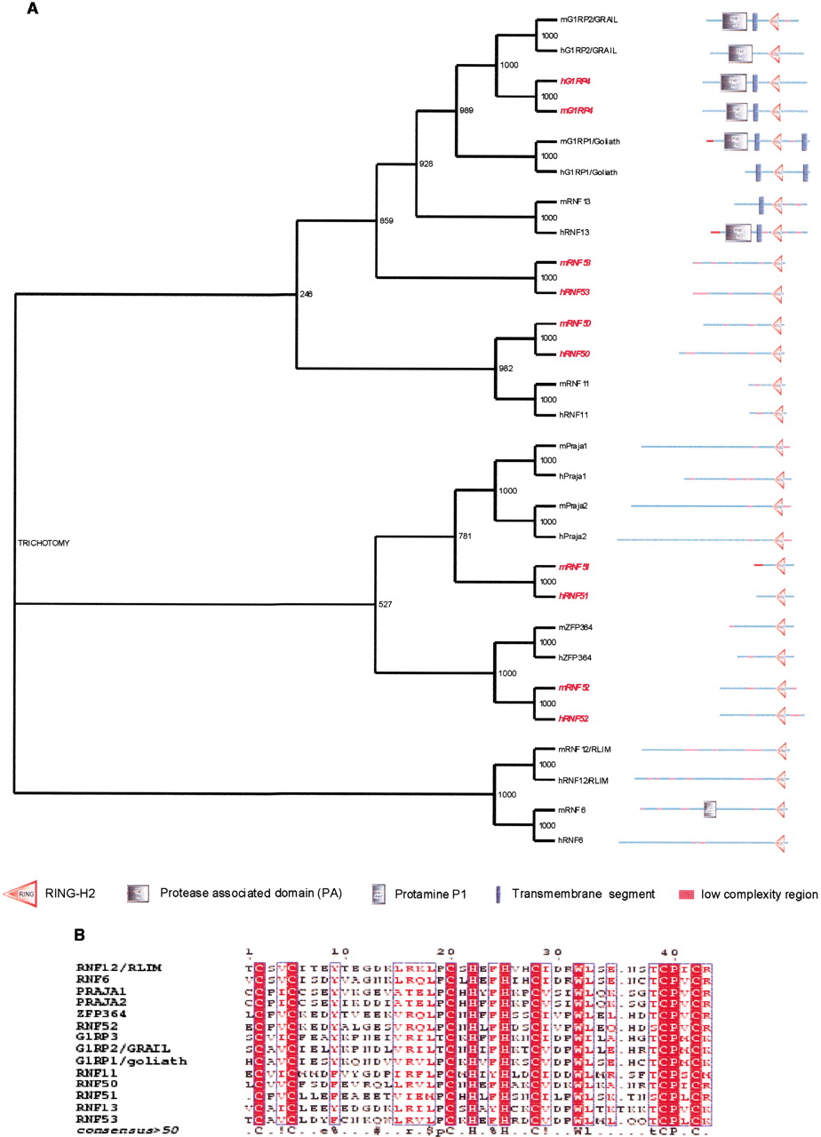 (A) Unrootedphylogeny of the cluster 7. The entire mouse and human protein sequences of the RING-H2 proteins (Table 5) were aligned and subjected to Neighbor Joining with 1000 bootstrap analysis. Domain architecture of the RING-H2 proteins is also shown in the picture. (B) RING-H2 zinc finger alignment of the C2H2 zinc finger consensus sequence is shown below the alignment. In red are highlighted the proteins described for the first time in this study.