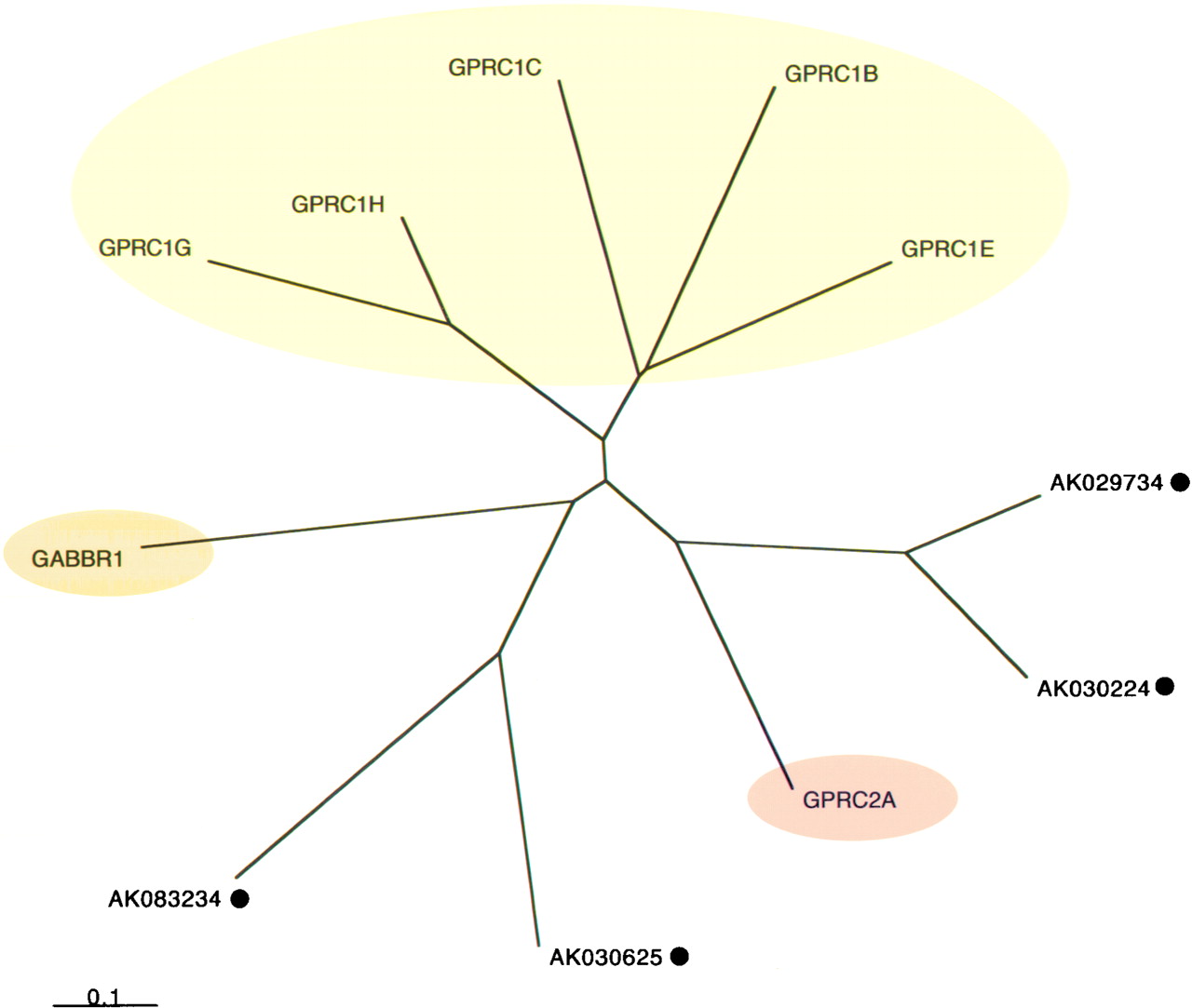 Classification tree (Family C). An unrooted tree was constructed for 11 GPCRs. The scale bar indicates a maximum likelihood branch length of 0.1 inferred substitutions per site. GPCRs that have cognate ligands are distinguished in colored subgroups. Orphan GPCRs are shown in uncolored branches, and novel genes are indicated with black circles. Abbreviations are shown in Supplementary Information 4.