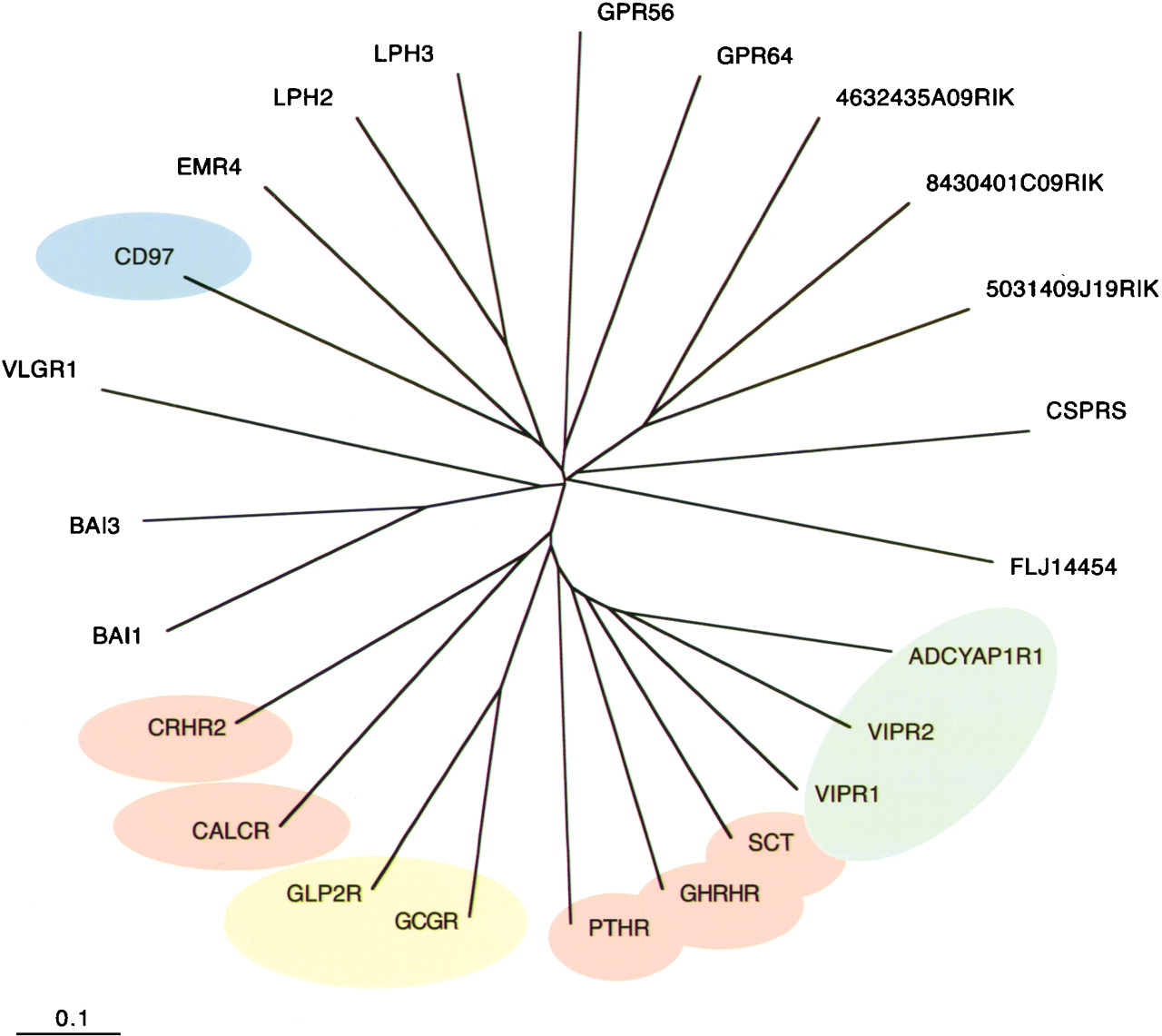 Classification tree (Family B). An unrooted tree was constructed for 24 GPCRs. The scale bar indicates a maximum likelihood branch length of 0.1 inferred substitutions per site. GPCRs that have cognate ligands are distinguished in colored subgroups. Orphan GPCRs are shown in uncolored branches. Abbreviations are shown in Supplementary Information 3.