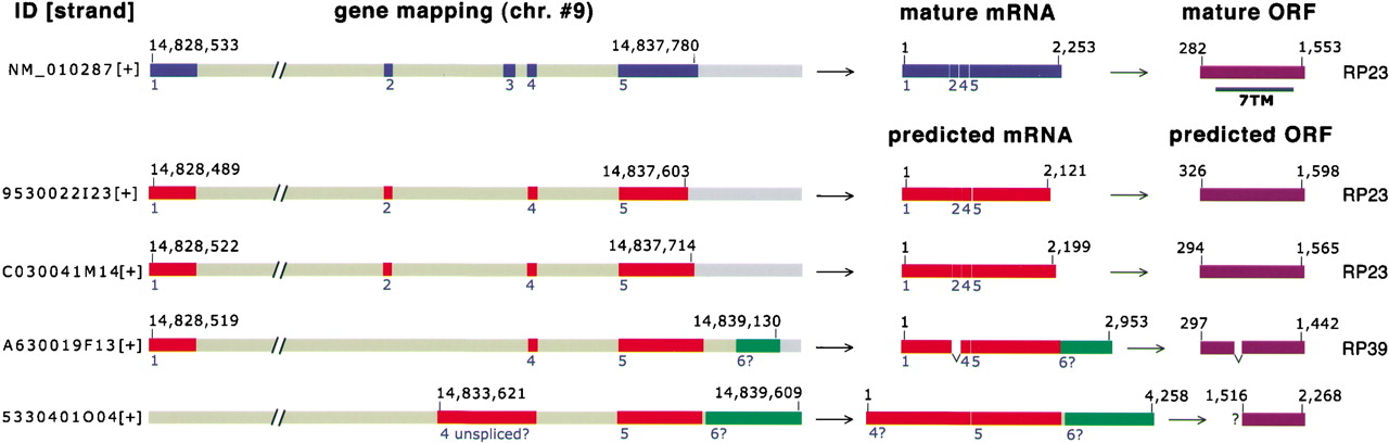 Predicted splicing variants of Gpr83. Schematic representation of the mouse GPR83 polypeptide and splicing alternatives generating the different variants. Chromosomal localization was obtained by genome mapping. NM_010287 is the Gpr83 gene registered in the public database, and blue bars represent each exon of Gpr83. Four RIKEN clones (9530022I23, C030041M14, A630019F13, and 5330401A04) were mapped against the Gpr83 gene; red bars represent the predicted coding region of each RIKEN clone. Edited mRNA and predicted ORF sequences are also illustrated. The seven transmembrane (7TM) region is shown in black bar. Green bars show the predicted coding regions that do not match data in the public database. Variants RP23 and RP39 have been described previously (Harrigan et al. 1991).