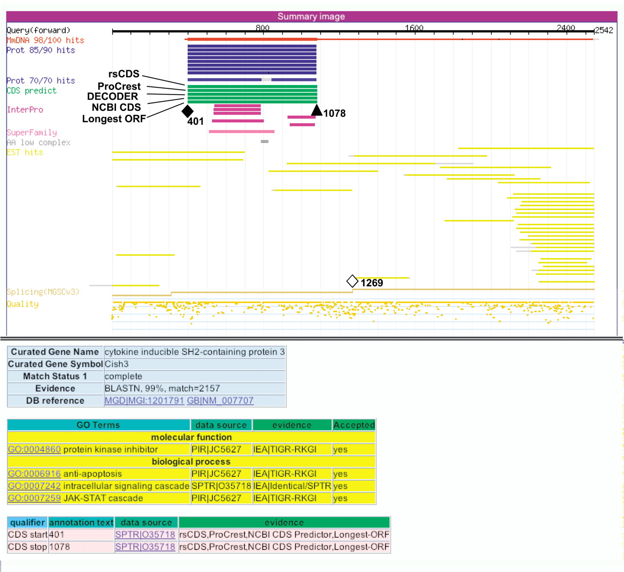 Annotation interface for clone B930030L03, a potential target for NMD-mediated instability. The CDS region of this clone was annotated from positions 401 (colored diamond) to 1078 (colored triangle), based on similarity with cytokine inducible SH-2-containing protein 3. The CDS for this clone violates the NMD rule for termination codons; the stop codon position (1078, colored triangle) is located 191 bases upstream from the last splice junction (1269, open diamond); thus, such transcripts in the cell may be targets for degradation by the NMD system.