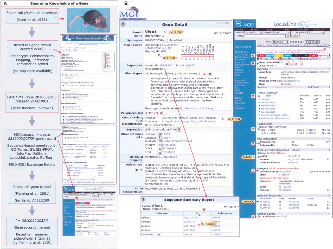 Gene Representation in MGI and LocusLink. (A) Emerging representation of the flexed tail gene (sideroflexin 1, Sfxn1). A gene record for the flexed tail (f) mouse mutation, described by Hunt et al. (1933), is created in MGI. Over time, MGI captures published information about the flexed tail locus; however, no sequence information is available. Clone 2810002O05, a novel mouse cDNA sequence is released with the FANTOM1 data, and a gene record is created in MGI and LocusLink for the sequence. Sequence-based annotations (GO terms, protein, domains, UniGene) are associated with gene 2810002O05Rik, and the MGI/LocusLink coordinated data exchange begins. LocusLink creates a RefSeq for the gene. After release of FANTOM1 data, Fleming et al. (2001) report the cloning of flexed tail and its sequence. Sequence analysis reveals that the flexed tail sequence is identical to the FANTOM1 cDNA. Gene 2810002O05Rik is merged with the flexed tail gene, and based on Fleming et al. (2001), the gene is renamed sideroflexin 1 (Sfxn1), for the siderocytic anemia and flexed tail phenotypes observed in mutant mice (see Fig. 4B). (B) Current representation of the Sfxn1 gene record in MGI and LocusLink, demonstrating the types of information integrated with sequences at the two resources. Wide arrows indicate data types shared between MGI and LocusLink, and the direction of transfer. MGI and LocusLink also exchange gene name synonyms and corresponding gene record identifiers. Hypertext links to various annotations and data are provided at both resources: official mouse gene nomenclature (MGI provides to LocusLink; A), mapping information (reconciled between MGI and LocusLink; B), allele and phenotype information (MGI; C), polymorphisms (LocusLink provides links to dbSNP, data not shown; D), gene ontology (MGI provides to LocusLink; E), homology information (MGI provides curated mammalian orthology data; F), expression (MGI; G), UniGene (H), LocusLink/MGI reciprocal links (I), mouse genome annotations (J), protein domains (also at LocusLink, data not shown; K), Database of Transcribed Sequences (DoTS, MGI; L), TIGR Mouse Gene Index (MGI; M), mRNA-genome alignments (LocusLink; N), references (O), RefSeqs (LocusLink provides to MGI; P), and sequences (exchanged between MGI and LocusLink; Q).