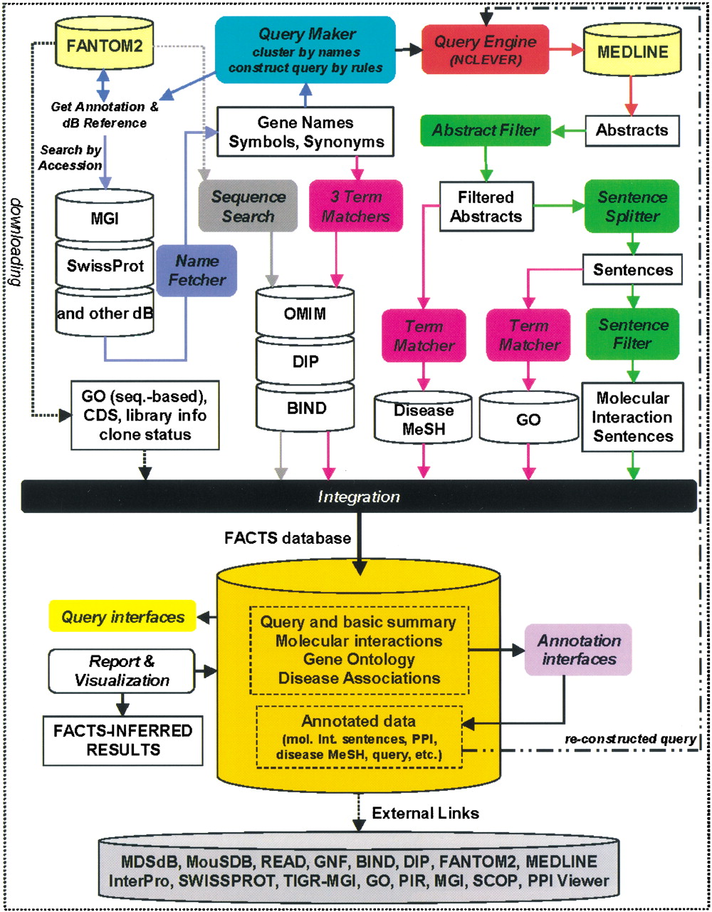 The FACTS System consists of 12 core programs (round-shaped boxes). External databases are FANTOM2 and MEDLINE. Other databases were installed locally. Arrows indicate the flow between programs and databases. Details are described in the text.