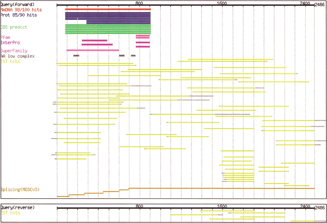 The CAS (cDNA Annotation System) presented as a graphic summary of the evidence supporting the annotation of the clone. Shown here are two panels with the evidence assigned to the forward and reverse strands, respectively. Black lines at the top of each panel represent query (cDNA) sequences. The color code is as follows: DNA hits, red; protein hits, blue; repetitive hits, dark gray; predicted CDS, green; motifs, purple; EST hits, yellow; and genome mapping segments (for identifying splicing), ocher. Light gray bars in the DNA or protein hits category indicate gapped regions in subject sequences.
