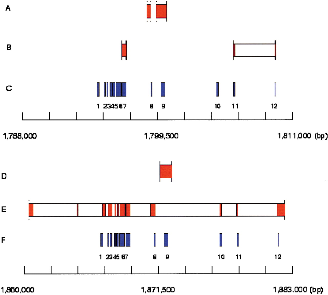 Exofish analysis on a region on arm 2L of the genome of Drosophila from two different releases of annotations, and around the same ecores. (Top) Results from release 2 of BDGP. (Bottom) Results from release 3 of BDGP. (A, D) BDGP annotations on the 5′-3′ strand. (B, E) BDGP annotations on the 3′-5′ strand. The genes are represented by boxes, with vertical lines separating exons (red) and introns (white). (C, F) Ecores (blue). In release 2 (top), five ecores (numbers 7, 8, 9, 11,12) overlap four gene models, and seven ecores (numbers 1, 2, 3, 4, 5, 6, 10) do not overlap any annotation. In release 3, a large gene model overlaps all the ecores that fall exclusively in exons except ecore number 9. This ecore is part of a gene model on the 5′-3′ strand, which is predicted inside one intron on the 5′-3′ strand.
