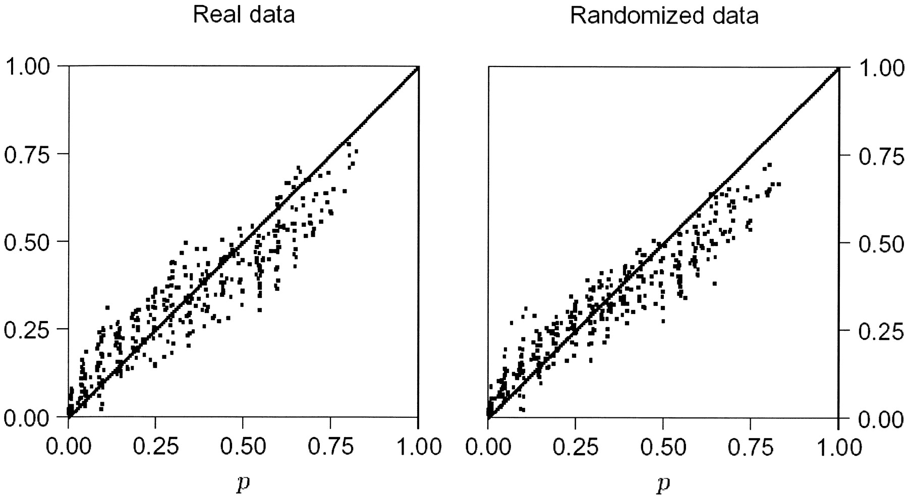 The cumulative distribution of P-values measuring significance of deviation from Hardy-Weinberg expectation. The cumulative frequency of P-values is plotted against each value of P for 100 Alu loci and 31 populations (left) and for 100 loci with the same allele frequencies but randomly assigned genotypes (right).