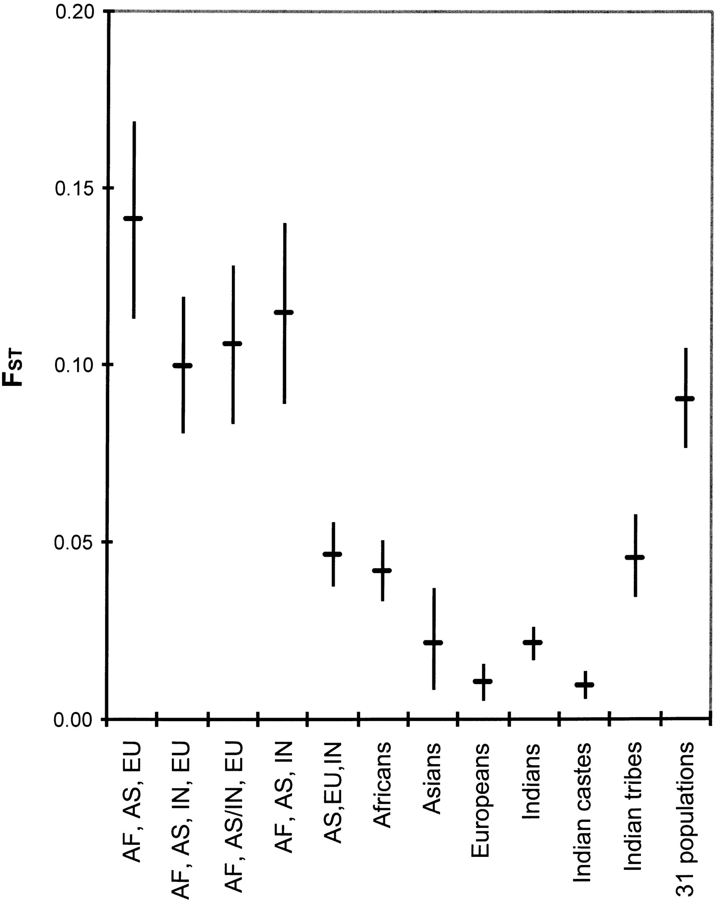 FST for world populations. FST estimates with 95% confidence intervals are shown for comparisons between major groups of Africans (AF), E. Asians (AS), Europeans (EU), and Indians (IN), for populations within the major groups, and for all 31 populations.