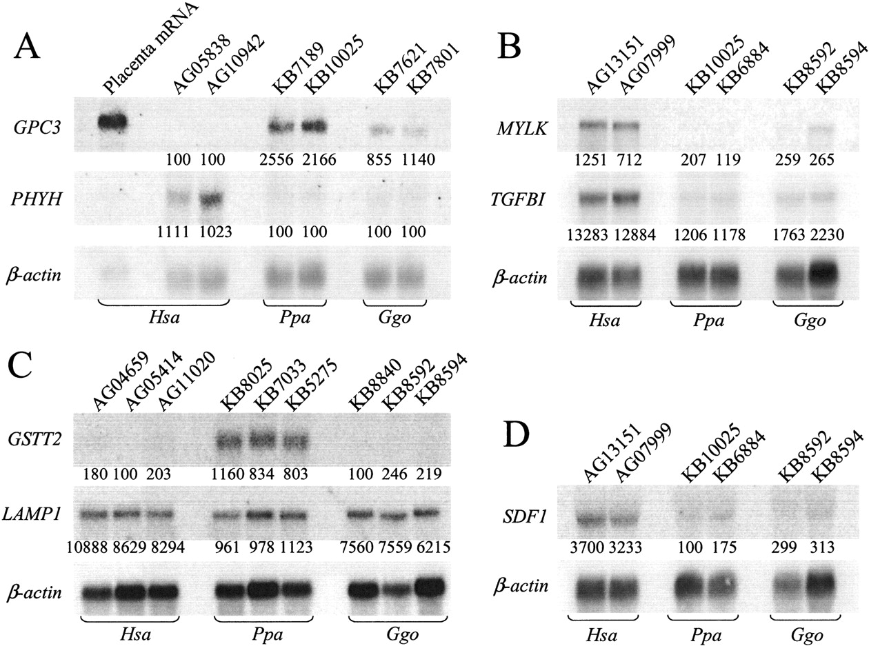 Confirmatory Northern blot analysis of microarray results. (A–D) Fibroblast cell line names are given at the top of each lane. At the bottom of each lane is the expression level score assigned by microarray analysis. To the left of each strip is the identity of the gene interrogated. In each panel, the relative abundance of β-actin for each blot is given to normalize for loading abundance. Signal gain and contrast in each strip is adjusted for clarity.