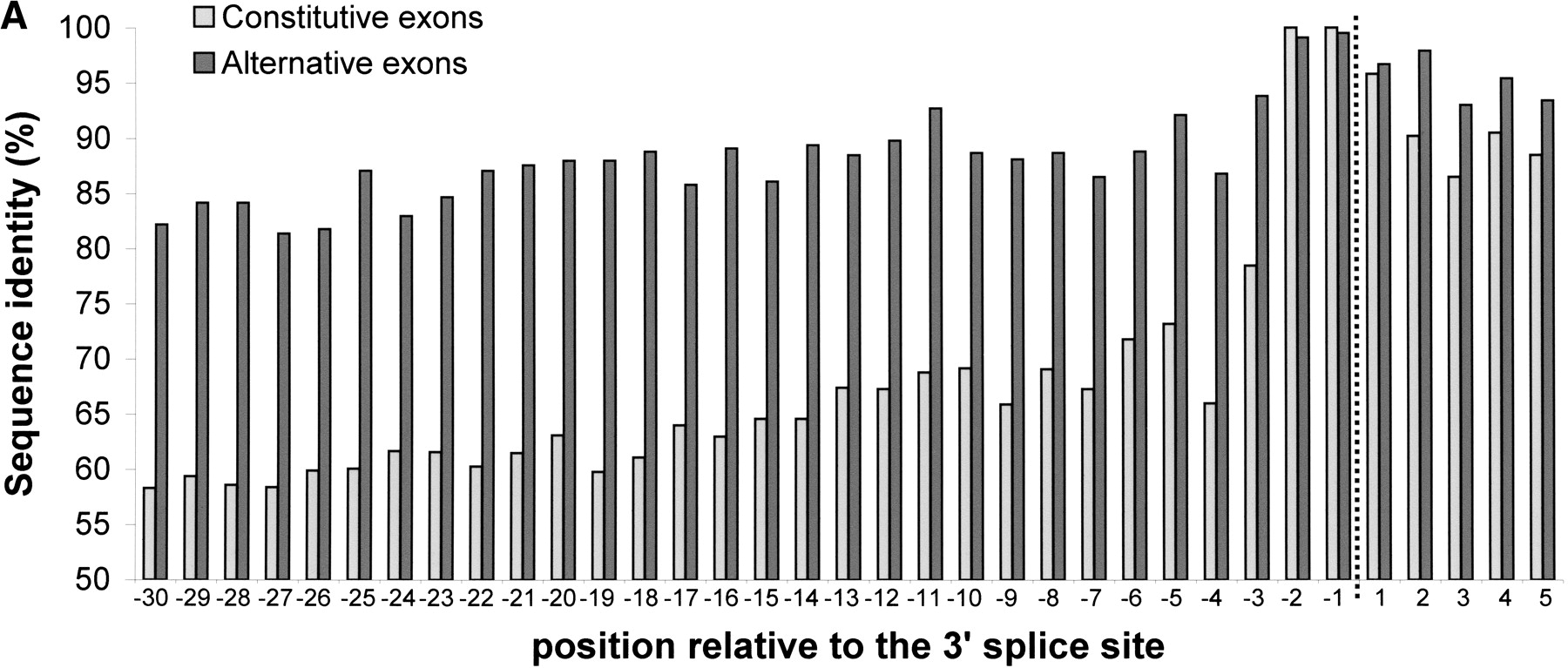Per-position conservation near alternatively and constitutively spliced exons. Intronic regions near the splice site were aligned, using GAP (global alignment program) of the GCG package, and identity levels were calculated for each position as described in Methods. All 243 alternative exons and 1966 constitutive exons were used for this analysis. (A) Conservation near the 3′ splice site. Data for the last 30 nt of the intron and the first 5 nt of the exon are shown. Dashed line marks the border between the intron and the exon. (B) Conservation near the 5′ splice site. Data for the last 5 nt of the exon and the first 30 nt of the intron are shown.