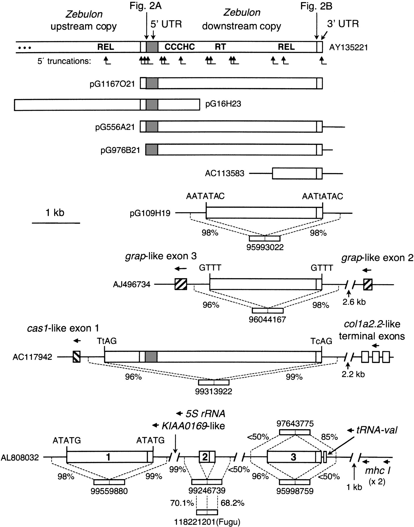 Genomic structure of Zebulon elements in T. nigroviridis. The position of 5′ truncations is shown by broken arrows. Most of them are from single sequences and could therefore not be assigned either to the upstream or to the downstream copy; they were arbitrarily positioned in the downstream copy. Trace sequences (http://www.ncbi.nlm.nih.gov/blast/tracemb.html) reflecting the genomic site before insertion are shown, and their percentage of nucleotide identity with the site sequences directly flanking Zebulon insertions is given. Horizontal arrows show the direction of gene transcription. Putative flanking target site duplications are shown. (RT) Reverse transcriptase; (CCCHC) putative CXCX3CX8HX5C zinc finger-like domain.