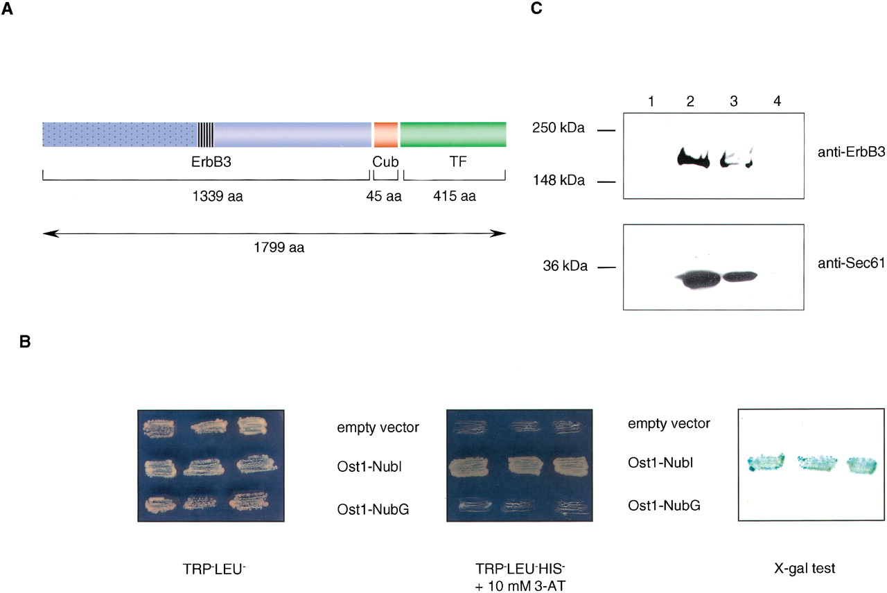 (A) The structure of the ErbB3-Cub-TF bait protein used in this study. Like other members of the ErbB family, ErbB3 is a type I transmembrane protein consisting of an extracellular ligand binding domain (blue dotted box), a single membrane-spanning region (striped box), and a cytoplasmic protein tyrosine kinase domain (blue open box). The ErbB3 bait was fused to Cub (red box), followed by an artificial transcription factor (TF; green box). The number of amino acids of ErbB3, Cub, and TF portions are indicated. (B) Growth of yeast cells expressing ErbB3-Cub-TF bait with various Nub-fusions on agar plates lacking tryptophan and leucine (left), and tryptophan, leucine, and histidine containing 10 mM 3-aminotriazole (3-AT; middle). The L40 yeast reporter strain was cotransformed with the ErbB3-Cub-TF bait and indicated prey plasmids, and three independent colonies were grown on Leu-Trp- and Leu-Trp-His-selective plates prior to assessment of β-galactosidase activity using X-gal filter test (right). (C) ErbB3 is localized within the yeast membrane. Cytosolic (lanes 1 and 3) and membrane (lanes 2 and 4) fractions of yeast cells expressing the ErbB3-Cub-TF bait were subjected to SDS-PAGE. The insoluble fraction (lane 2) was treated with 1% Triton X-100 to solubilize the proteins, and centrifuged to separate the soluble (lane 3) from insoluble proteins (lane 4). The ErbB3-Cub-TF bait and a control endogenous yeast membrane protein Sec61p were detected by immunoblot analysis using a mouse monoclonal anti-ErbB3 antibody (upper panel), and an anti-Sec61 polyclonal antibody (lower panel). The positions of molecular markers are indicated.