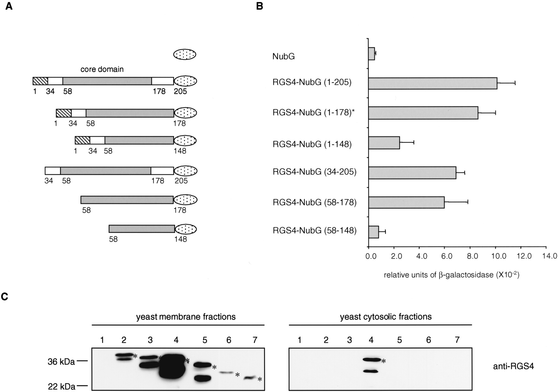 Mapping of the ErbB3 interaction domain within RGS4. (A) RGS4-NubG deletion constructs. RGS4 contains an N-terminal amphipathic region important for membrane localization (amino acid 1–33, striped box) followed by the RGS box (amino acid 58–178, grey box) and the C-terminal tail (amino acid 179–205). The NubG domain of ubiquitin is shown as a dotted ellipse. (B) Quantitative β-galactosidase assay showing the binding of different RGS4-NubG deletion mutants to the ErbB3-Cub-TF bait. Values given are the mean of four transformants, each assayed at least twice. The asterisk indicates the original RGS4 clone isolated in the split-ubiquitin membrane yeast two-hybrid screen. (C) Expression and localization of the RGS4–2HA-NubG deletion mutants. The RGS4–2HA-NubG deletion mutants were generated by PCR followed by in vivo recombination into the prey plasmid pADH-PREY-2HA-NubG previously digested with NdeI. Western blot analyses were performed using membrane (left panels) and cytosolic (right panels) fractions of the yeast L40 reporter strain expressing ErbB3-Cub-TF and the prey NubG (lane 1), RGS4-NubG (1–178; lane 2), RGS4-NubG (1–205; lane 3), RGS4-NubG (34–205; lane 4), RGS4-NubG (1–148; lane 5), RGS4-NubG (58–178; lane 6), and RGS4-NubG (58–148; lane 7). The blots were incubated with anti-RGS4 antibody. The positions of molecular markers are indicated. The bands that are not marked with an asterisk are considered as degradation products of RGS4. The RGS4-NubG (1–178) protein found in the split-ubiquitin membrane yeast two-hybrid screen (lane 2) migrates more slowly than the RGS4-NubG (1–205; lane 3) because it contains an additional 45 amino acids upstream of the initial RGS4 start codon.