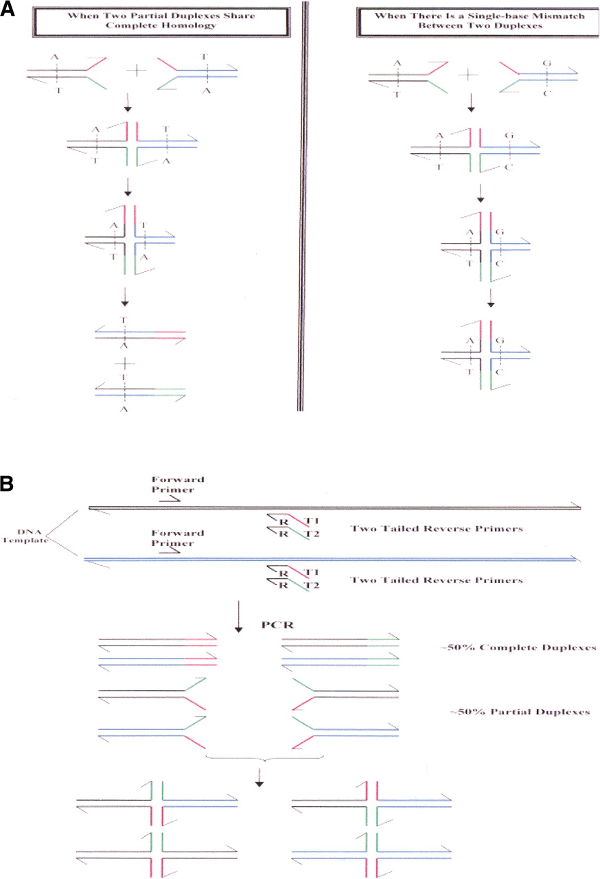 Mismatch-induced Holliday Junction formation. (A) A single-base mismatch between two partial duplexes impedes branch migration and causes the stabilization of the Holliday Junction formed between the two partial duplexes through the annealing of their complementary tails. (B) Illustration of partial duplex and Holliday Junction formation by using PCR.