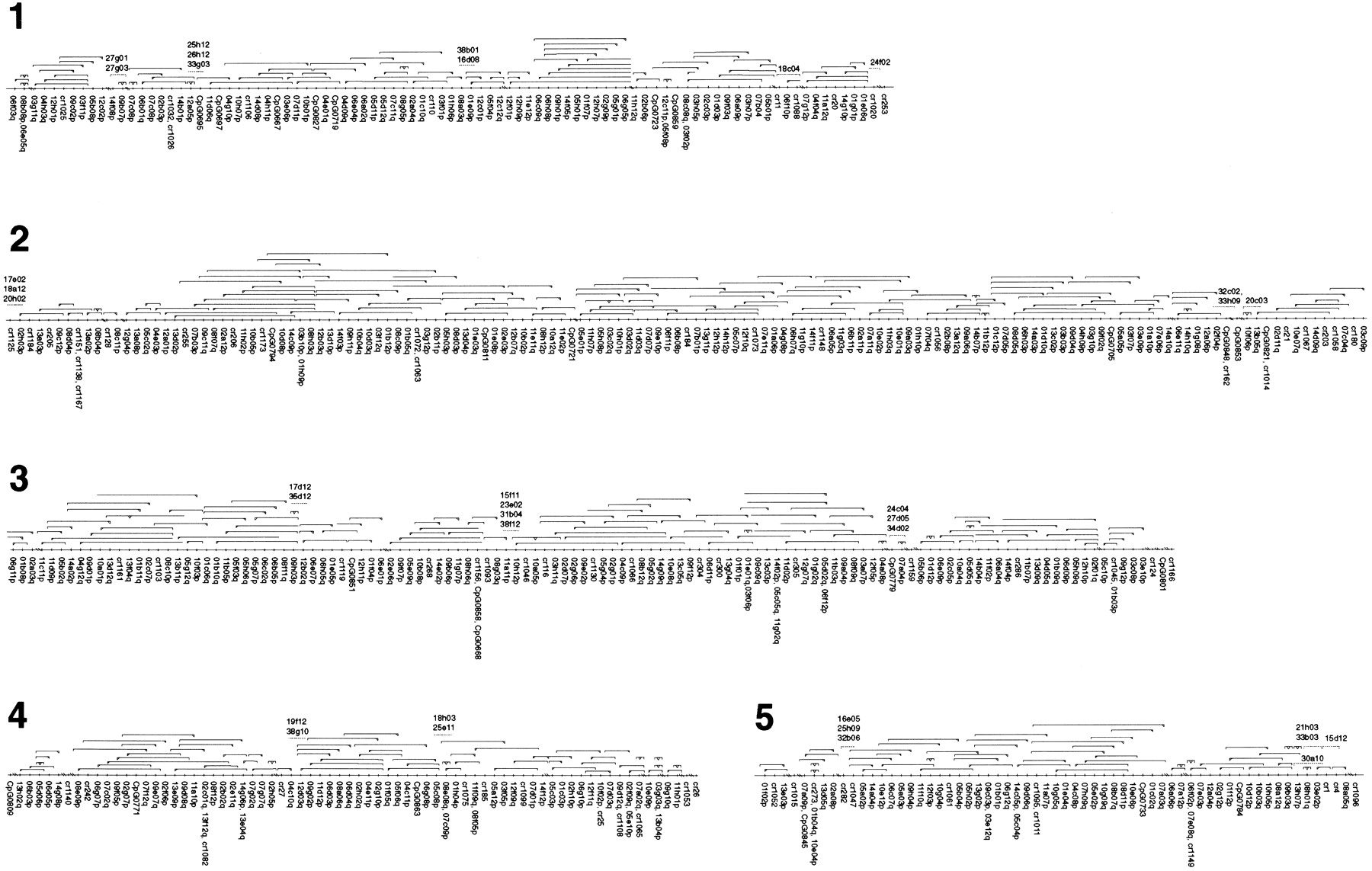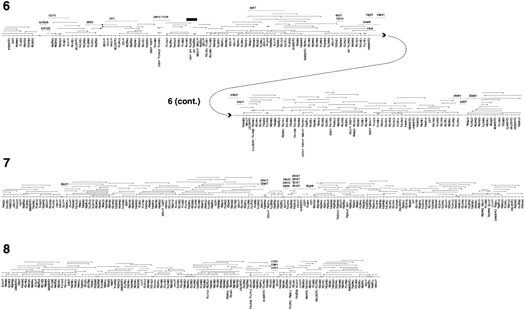 Genome-wide HAPPily anchored physical map. For clarity, markers are shown equally spaced. For each chromosome, HAPPY marker names are given below the map; names beginning `cr' and `CpG' indicate markers taken from Piper et al. (1998a) and from database sequences, respectively. Other names represent PAC end-sequences in condensed form; `q' = SP6 end, `p' = T7 end; for example, 06f03q is the SP6 end of the PAC clone pica_0006_f03. PAC clones are shown above each chromosome; the clone end represented by the mapped marker is indicated by a triangle; a short vertical line at the opposite end of a clone indicates that it ends within the interval shown; lack of this vertical line indicates that the clone may extend further than shown. Additional PAC or BAC clones identified during preliminary gap closure are indicated by dashed lines with the condensed clone name above them (names prefixed with `b' are BAC clones). Physical gaps are indicated by paired diagonal lines; the order of segments between these gaps is determined by the HAPPY data; the orientation of some of the smallest segments is not rigorously determined. Chromosome 6 is depicted in two parts; clone b3b01 is shown on both parts to illustrate the overlap. Solid triangles indicate deletions in clones; the solid black rectangle indicates a region of chromosome 6 which was sequenced by PCR amplification based on the corresponding part of the Moredun isolate genome (see text).