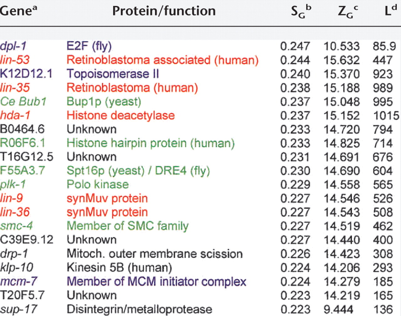 a Red denotes a gene from the query, blue denotes two genes known to interact with Rb not included in the query, and green denotes genes involved in the cell cycle or chromatin modeling.