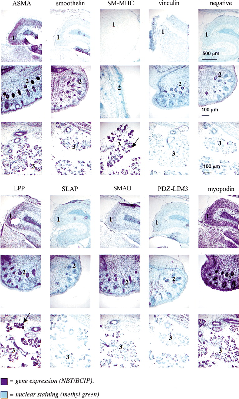 Ectopic expression of SMC markers in the CNS, hair follicles, and the submandibular gland. Expression in the submandibular gland epithelium was confined to the distal tubular system(arrows). 1: CNS, 2: hair follicle dermal sheaths, 3: submandibular glands.
