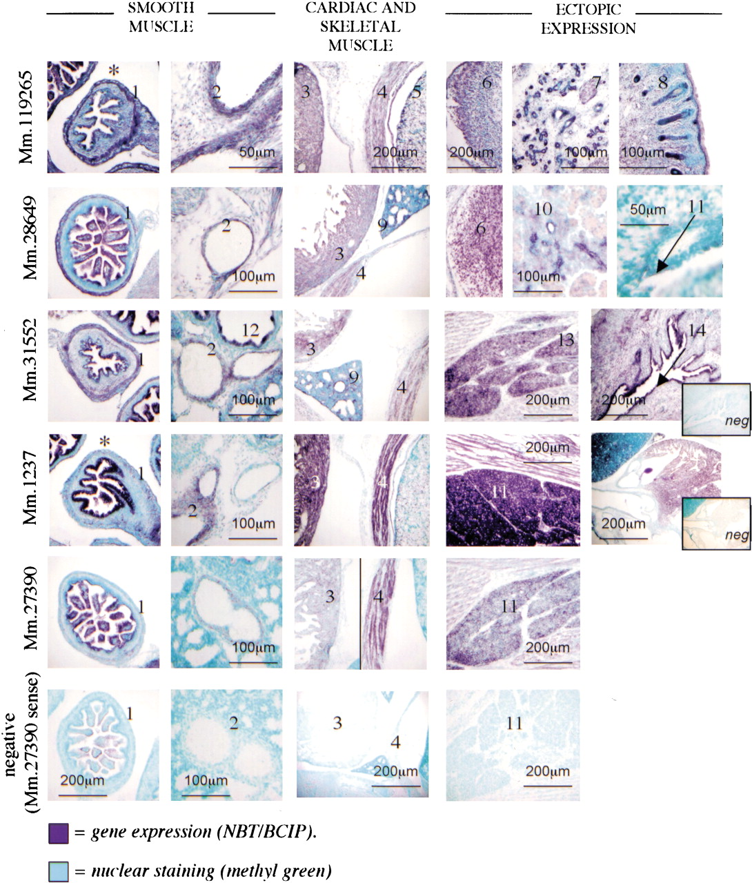 ISH data for SMC marker-related genes. Expression was prominent in muscle cells but was also seen in a range of ectopic sites. 1, Intestinal SMC; 2, vascular SMC; 3, cardiac muscle; 4, diaphragm (skeletal muscle); 5, liver parenchyma; 6, CNS; 7, submandibular gland; 8, hair follicle (general mesenchymal expression seen); 9, lung parenchyma; 10, pancreas; 11, liver; 12, airway; 13, brown adipose tissue; 14, urinary bladder. Intestinal lumen artefact staining is due to endogenous alkaline phosphatase activity (asterisk).