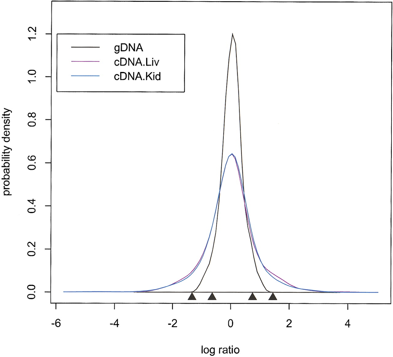 Distribution of ratios of the fluorescent intensities between the two alleles for genomic DNA and cDNA. The ratios were computed as (PMA - MMA)/(PMB - MMB) for each SNP for every sample. From the ratios in genomic DNA samples, the 1-SD interval around the mean is between -1.27 and 1.17 in log scale. The interval in log scale corresponds to the interval between 0.28 and 3.22 for the ratios. We selected 602 SNPs for analysis (for selection criteria, see Methods). To compare the distributions of ratios in genomic DNA and cDNA, we plotted frequency of samples against the log ratio. Density functions for genomic DNA, kidney cDNA, and liver cDNA are represented by a black line, blue line, and purple line, respectively. Black triangles, from left to right, indicate X coordinates at log(0.25), log(0.5), log(2), and log(4). The coordinates at log(0.5) and log(2) represent twofold ratios, and log(0.25) and log(4) represent fourfold ratios. The density functions for the kidney cDNA ratios and the liver cDNA ratios are similar. Both have a wider spread compared to the density function for the genomic DNA.