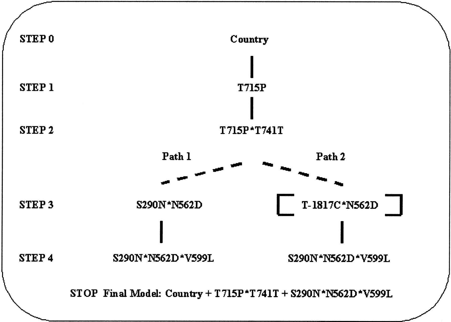 Summary of the results obtained in the application of DICE to the association between myocardial infarction and nine polymorphisms of the SELP gene, using a codominant coding scheme (n = 1147). Dashed lines represent tie models. The terms deleted after the conditional exclusion phase are shown in brackets.