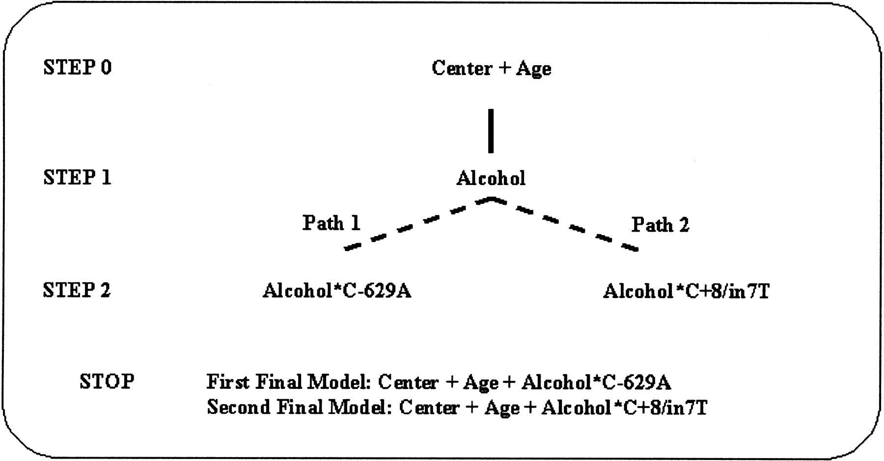 Summary of the results obtained in the application of DICE to the association between HDL-cholesterol and seven polymorphisms of the CETP gene, using a dominant coding scheme (n = 671). Dashed lines represent tie models.