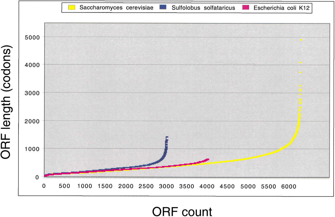 Bacteria and Archaea encode smaller proteins than eukaryotes. The number of codons in each ORF for the indicated organisms was sorted in Excel, and a point was plotted for each protein. It can be seen readily that both the mean length and total length of the eukaryotic proteins are significantly higher than those of both the eubacterial and archaeal species. Results are typical (data not shown).