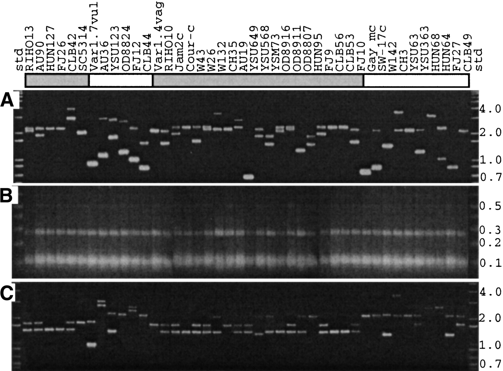 Characterization of ALS7 alleles by PCR and restriction analysis in the 42 strains of model Set 1. GPG cluster strains are marked by a shaded bar under the strain name, other strains by a hollow bar. (A) PCR amplification of the tandem repeat domain, using primers MC5inpf and MC5repr. (B) BsmAI digest of the products; a single BsmAI site in each 108-bp repeat is predicted from the nucleotide sequence, and so digestion of the PCR product should produce a 108-bp band plus three other bands of very similar molecular weight: an 80-bp band from the 5′ flanking sequence and bands of 95 bp and 116 bp from the 3′ flanking sequence. In addition, there should be a 270-bp band from the 3′ flanking sequence. (C) Amplification of the VASES region, using primers MC5spF andMC5pf. Numbers at the right of the figure give fragment sizes in kb.