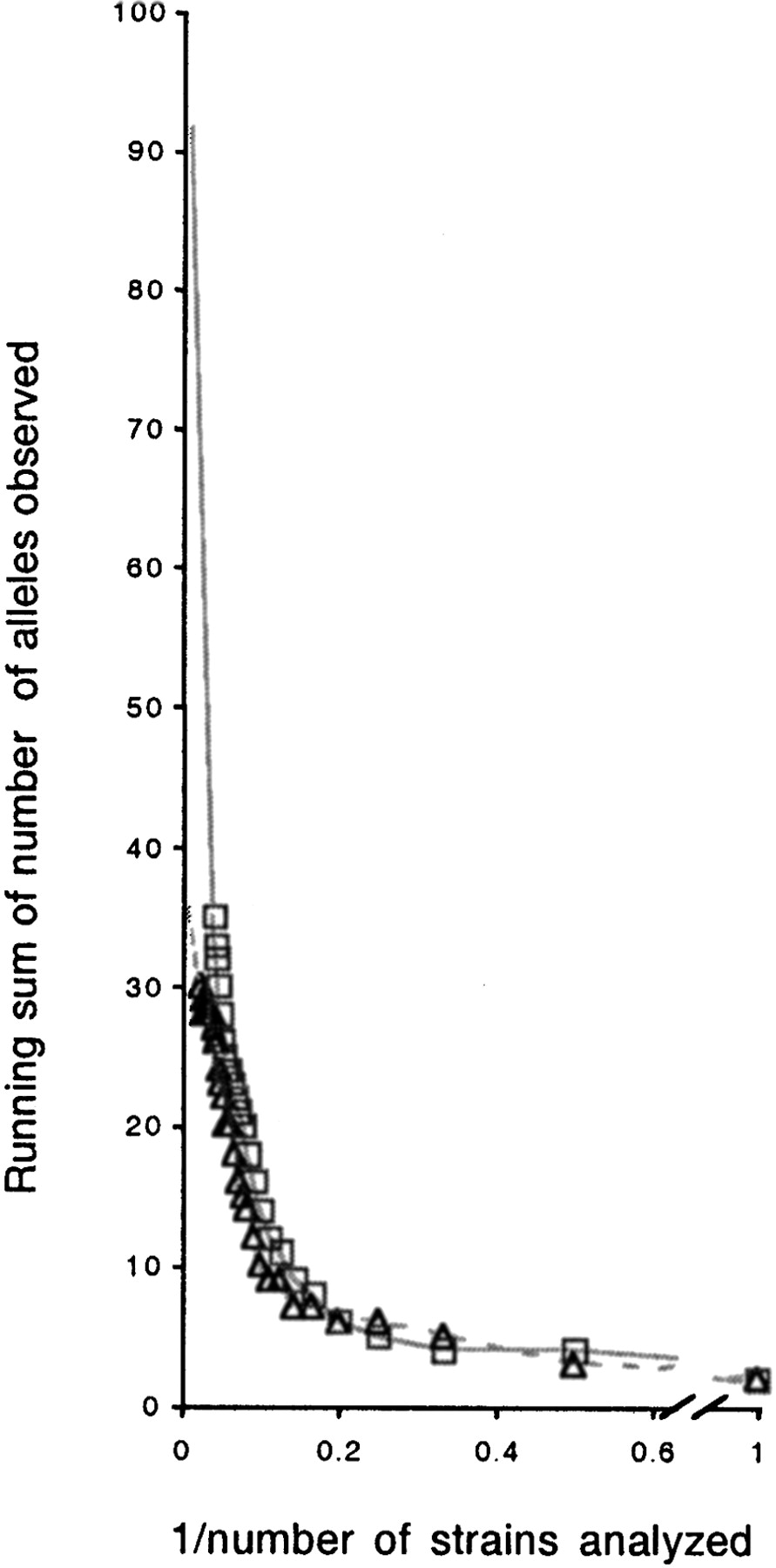 Running sum of the number of different alleles found in cluster strains (triangles, dashed line) and in noncluster strains (squares, solid line) plotted against 1/(running sum) of strains analyzed. The intercept of the trend lines with the y-axis gives an indication of the number of alleles that should be observed if an infinite number of isolates were analyzed.