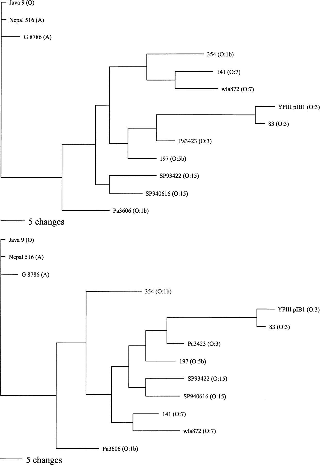 Parsimony analysis of Y. pseudotuberculosis and representative Y. pestis strain microarray data. The two most parsimonious trees are shown. Of 87 variable characters, 63 were parsimony informative and equally weighted. Y. pseudotuberculosis strain names are followed by their serotype in parentheses. Three Y. pestis strains are shown, one from each of the main clades in Fig. 3 and are followed by their biovar in parentheses. Horizontal scale bar indicates number of character changes (Reanalysis omitting all characters pertaining to the O-antigen locus gives a similar result, see Supplemental Data).
