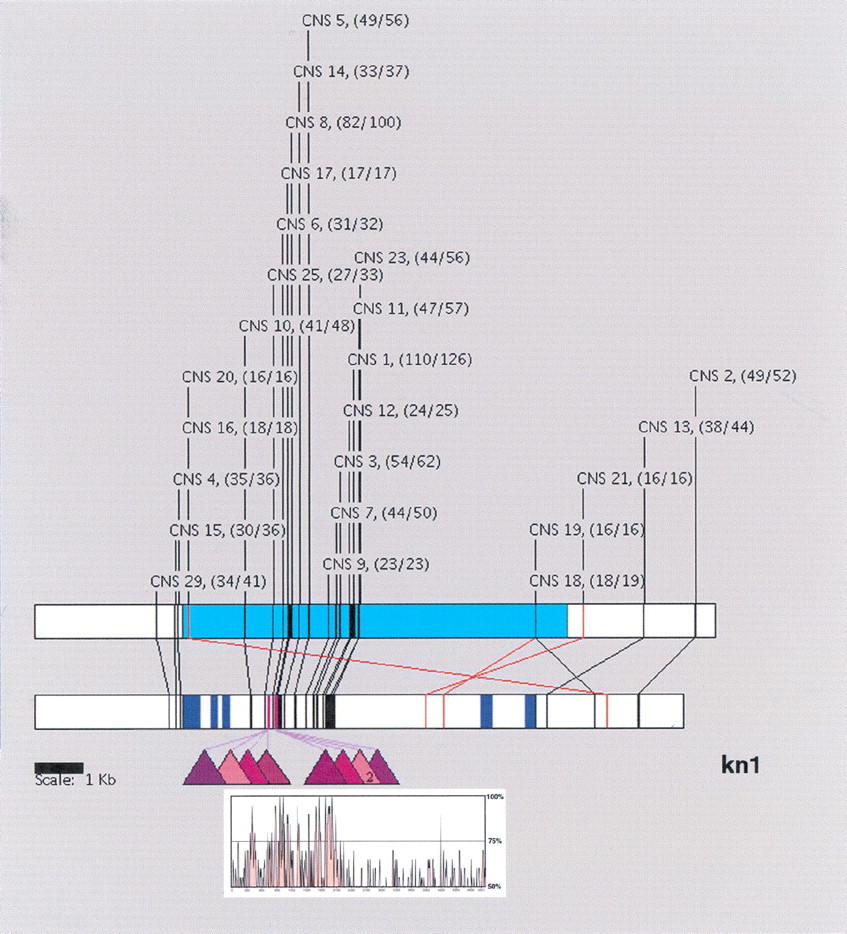 CNSs may bind a negative regulatory factor(s). Greene and coworkers (1994) positioned nine transposon insertions (colored triangles) within the third intron of the knotted1 Class I homeobox gene in maize. These insertions were found as dominant mutants conferring ectopic gene expression and phenotype. Note how they cluster in a region rich in CNSs. The bottom-most plot is a global alignment of the third intron (Vista; Loots et al. 2002), showing bp identity in a 20-bp sliding window.