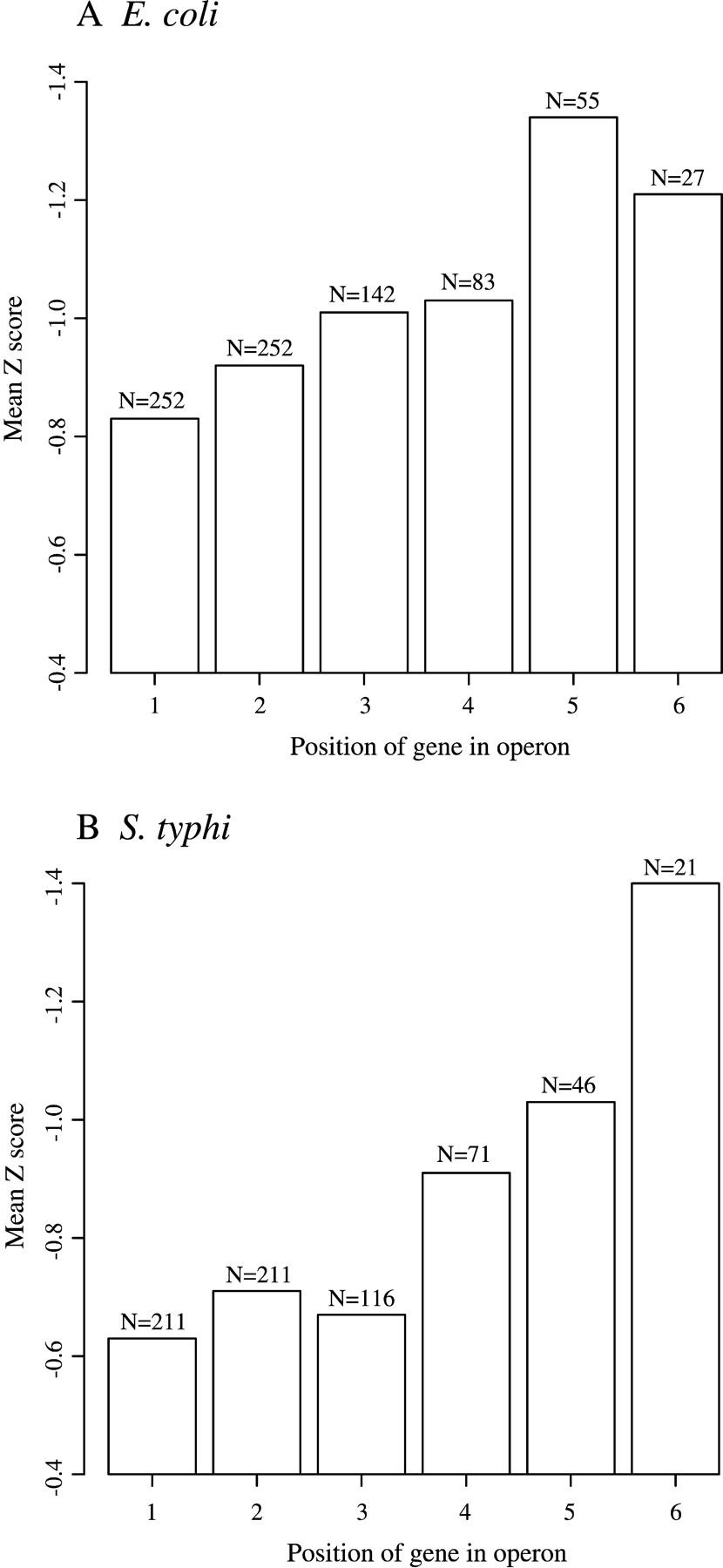 Bias for secondary structure in bacterial operons. Operons were classified on the basis of their locations in annotated polycistronic messages, and the average Z score was calculated for each subset. Numbers 1–6 correspond to the location of genes within operons relative to the 5′ end of the transcript. Genes in position 7or higher within operons are not shown. The number of genes in each data set is indicated.