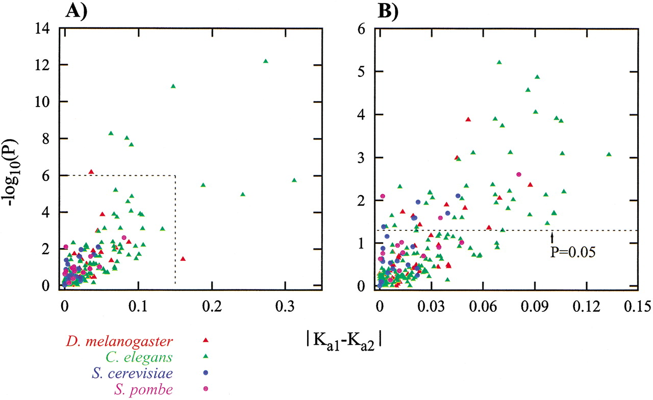 Significance of observed differences in Ka. On the X-axis is plotted the absolute value of the difference in Ka value between two duplicates. The Y-axis gives the negative logarithm (to base 10) of the P value for that pair. (A) All asymmetric duplicate pairs shown. (B) Only the square region marked in panel A is shown. The dashed line in B shows the significance level of P = 0.05.