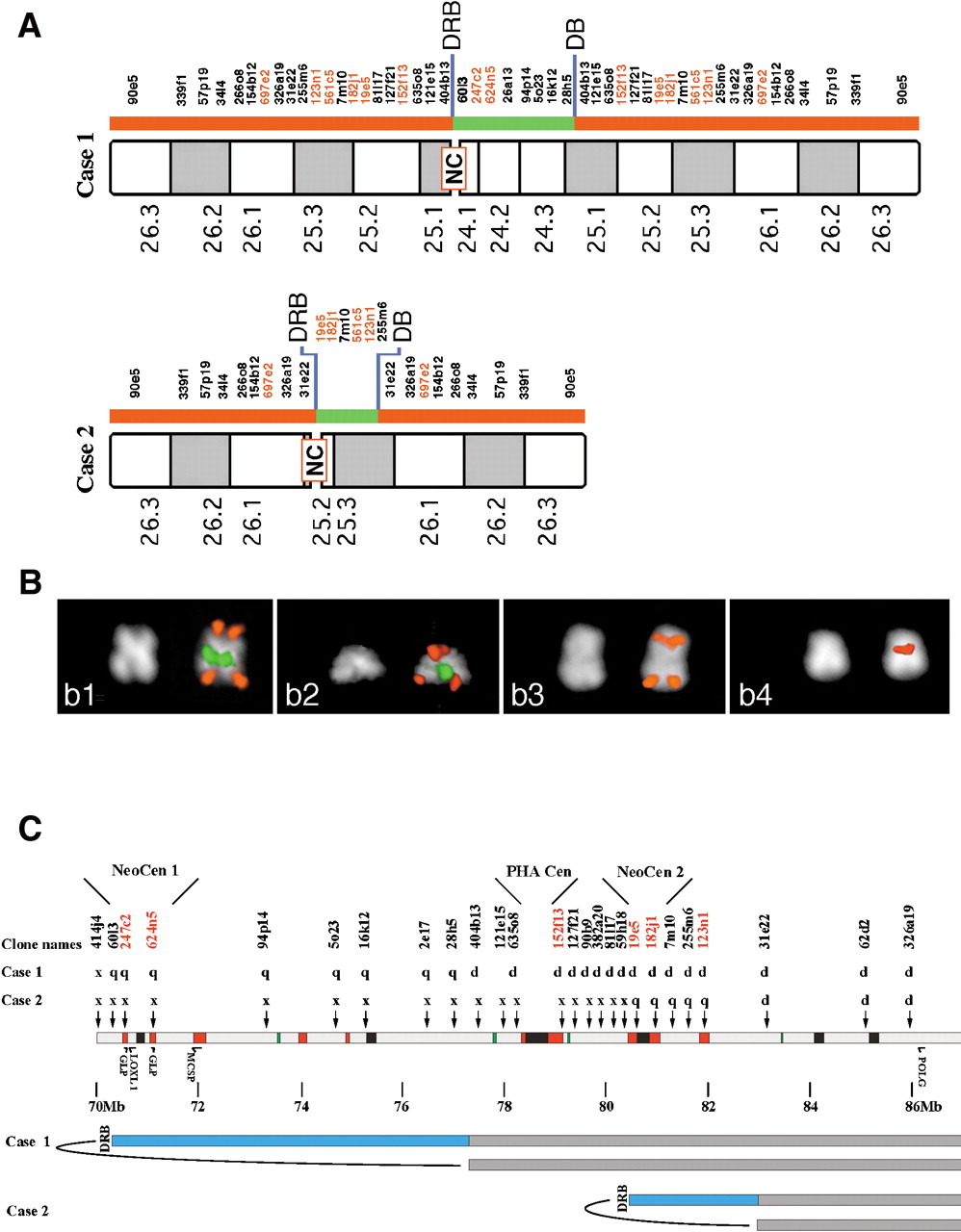 Delineation of neocentromeres in 15q24-26. (A) results of FISH experiment performed on the two marker chromosomes showing neocentromere (NC) emergence using a large panel of probes located in the interval HSA15q24-qter. BAC probe names are shown, with BACs which are duplicated in both HSA and PHA shown in red (for details see text). (B) examples of FISH experiments. Panel b1: Case 1: co-hybridization of BACs RP11-90e5 (red) and RP11-26a13 (green). b2: Case 2, BAC RP11-90e5 (red signal) cohybridized with BAC 182j1 (green). b3: Case 1, RP11-57p19. b4: Case 2, BAC RP11-19e5. The map position of probes used in FISH experiments is shown in (A). The asymmetric position of the centromere is evident from the DAPI staining. Centromere position was inferred from chromosome morphology, as evident from DAPI, and from proximity of FISH signals of the two chromatids that reaches its maximum at the centromere. (C) Position of neocentromeres relative to ancestral centromere and features within 15q24-26. Human BACs used to probe PHA metaphases are indicated, together with the result of the hybridization on each marker chromosome. p, p arm only; q, q arm only; d, p and q arm, flanking the centromere; x, no signal. Sequence features are as in Fig. 2. DRB, duplication and rearrangement boundary; DB, duplication boundary. Neocentromere 1 maps between BACs 60I3 and 94P19, and neocentromere 2 maps between BACs 19E5 and 7M10. The locations of two genes have been added to allow comparison with the map of the DUP25 region; from left to right these are LOXL1 and POLG. The proximal breakpoint leading to DUP25 formation (Gratacos et al. 2001) maps close to the DRB of Case 1. In addition, the position of the potentially functional copies of golgin (GLP) and chondroitin (MCSP) are shown.