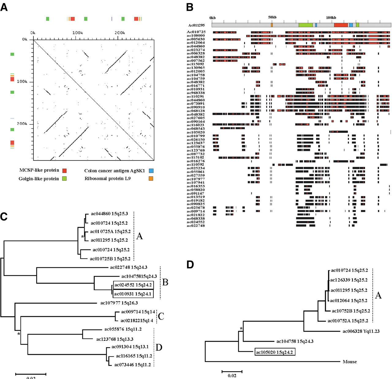 Analysis of 15q24-26 duplicons. (A) Dot matrix self-comparison of 15q25.2 duplicon (accession nos. AC011295 and AC010724; position 78744–79029 kb). A 30-bp perfect match was required to generate a dot, and a 30-bp offset was used. The position of gene-related sequences are indicated by colored boxes. The GLP and MCSP sequences span exons and introns of the functional genes, but do not retain the full coding sequences. The sequences share 81%–89% identity to the functional GLP gene and 82%–94% identity to the functional MCSP gene. The position of two unspliced transcripts that were highly similar to the region are also shown. BC004206 shares 100% identity to the sequence and is related to ribosomal protein L9. This is a retroposed copy of exons 2–8 of the true gene from chromosome 4. AF316855, an unspliced mRNA for colon cancer antigen AgSK1, shares 99.1% identity to the sequence but with a 61-bp insertion/deletion. We have also classed this sequence as a pseudogene. (B) Physical overlap of top 55 high-scoring BLAST hits with AC011295 (1–149 kb of A). High identity to the RepeatMasked test sequence is shown by black lines. The position of gene-related sequences (from A) and the scale in kb are shown. (C) Maximum likelihood tree of GLP sequences identified in (B). Alignment was constructed using sequences related to nt 71235–73570 of AC011295 which are within the GLP region but noncoding. Only sequences integrated into the working draft and the 15q24-26 map (Fig. 2) are included (see Methods). This tree has been arbitrarily rooted along the midpoint for ease of presentation, so ancestor-descendent relationships cannot be inferred from the topology. All nodes are supported by >95% bootstrap values with three exceptions, which are indicated with an asterisk. The sequences predicted to represent functional GLP genes (intact full-length ORFs and EST support, see Fig. 3) map to 15q24 and are boxed (AC010931, ac024552). All other GLP sequences are truncated with the exception of AC019294, which is full-length but contains multiple frame shift mutations. (D) Maximum likelihood tree of chondroitin sequences identified in (B). Alignment was constructed using exons 2 and 3 minus the intervening intronic sequence. Only sequences integrated into the working draft or the 15q24-26 map (Fig. 2) are included (see Methods). The mouse MCSP mRNA sequence was used as an outgroup. All nodes are supported by >95% bootstrap values with one exception, which is indicated with an asterisk. A trichotomy containing ac010724A, ac126339, and ac011295 is not clearly visible due to the extremely high sequence identities (∼99.9%) between these sequences and ac012064. The sequence predicted to represent the functional MCSP gene (intact full-length ORF with EST support, data not shown) maps to 15q24.2 and is boxed (AC105020). All other MCSP sequences are truncated relative to this sequence. A tree constructed using intronic sequences from the same loci (excluding mouse) gave results consistent with the topology shown (data not shown).