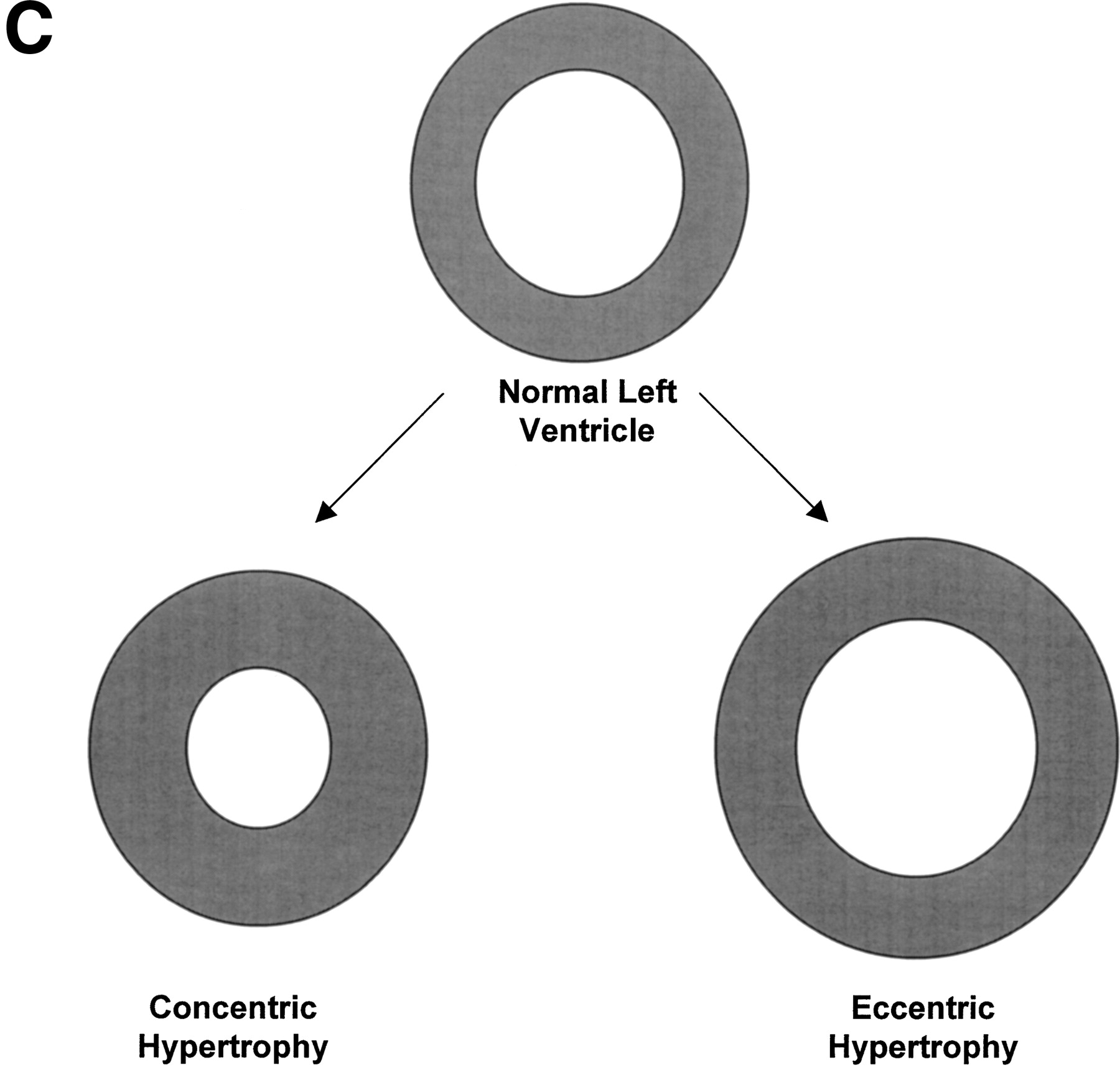 Anatomy of the left ventricle showing the various measurements and how they were used to calculate other measures of CV functions. (A) A schematic illustration of the heart showing the position of the transducer in transthoracic echocardiography. (B) A schematic illustration of an echocardiogram obtained with the transducer in the position shown in A. The wall thicknesses and left ventricular dimensions are labeled. (C) Concentric vs. eccentric hypertrophy. In concentric hypertrophy, wall thickness increases at the expense of cavity dimensions, so relative wall thickness increases, whereas in eccentric hypertrophy, wall thickness and cavity dimensions change proportionally, so relative wall thickness remains unchanged.