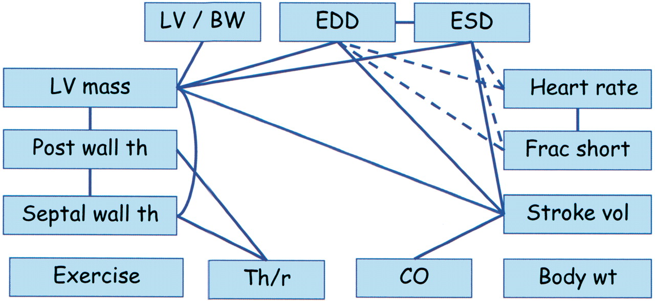Network of CV traits. Solid lines indicate positive relationships and broken lines indicate inverse relationships. Abbreviations are described in the text.