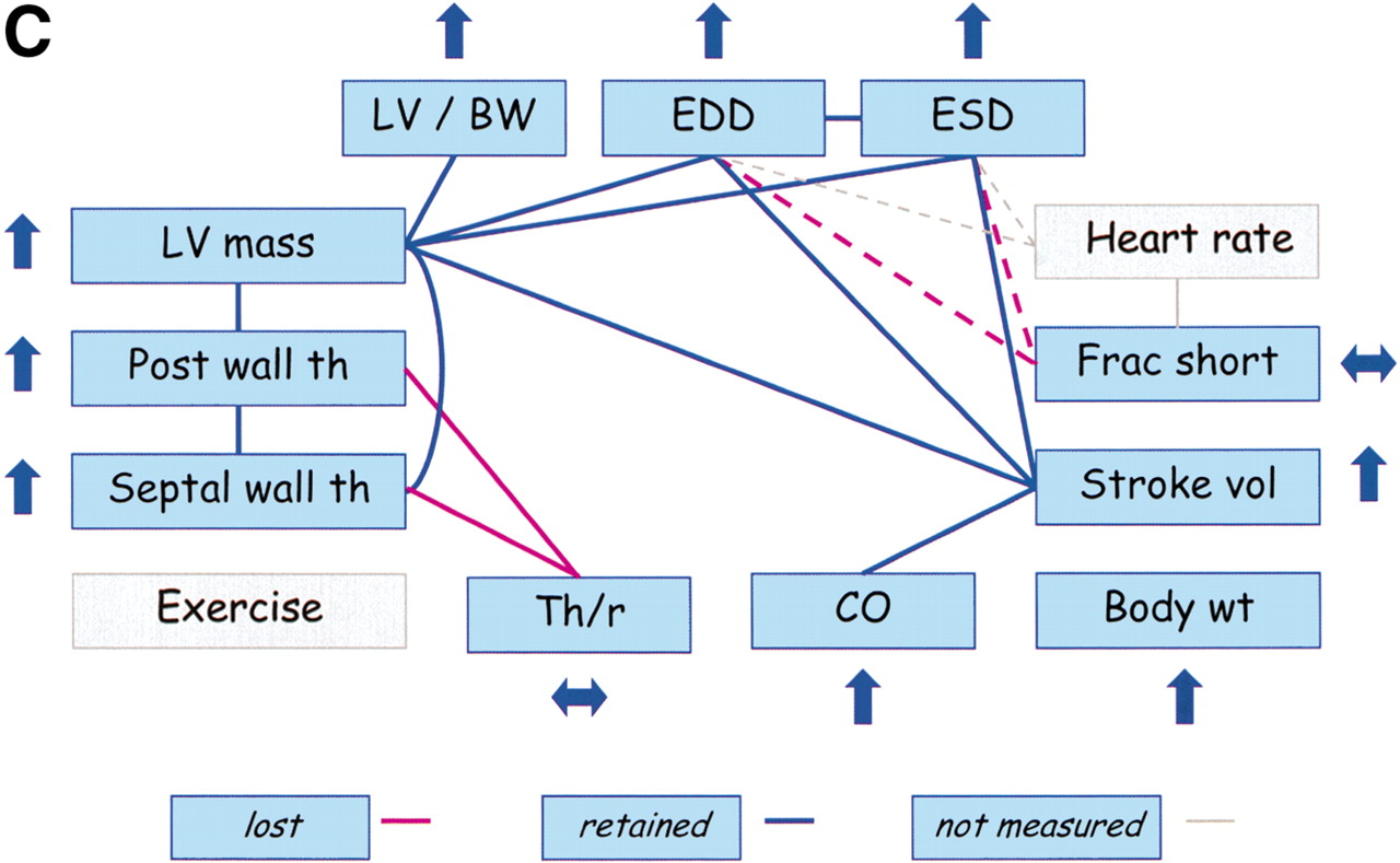 Trait relationships in mutant mice with CV pathology and mice treated with anesthesia. Traits not measured in the studies are highlighted in gray. Upward arrows indicate that the mutant (or treated) mice had significantly higher trait values than wild-type (or untreated) mice, and downward arrows indicate that the mutant (or treated) mice had significantly lower trait values than wild-type (or untreated mice). Double-headed (horizontal) arrows indicate an insignificant difference between mutant (or treated) and wild-type (or untreated) mice. The red lines indicate the PSN relationships that do not appear to be present in mutant (or treated) mice. (A) Trait relationships for mice with cardiac-specific overexpression of calsequestrin. Ten–12-wk-old mice were anesthetized with 2.5% Avertin (Schmidt et al. 2000). (B) Trait relationships in transgenic mice with overexpression of protein kinase C β2 isoform in myocardium. Eleven-wk-old mice were anesthetized with 2.5% Avertin (Wakasaki et al. 1999) (C) Trait relationships in transgenic mice with reduced brown fat. Twelve-wk-old mice were anesthetized with ketamine and xylazine (Cittadini et al. 1999). (D) Trait relationships in conscious and anesthetized mice. Twelve-wk-old mice were analyzed without anesthesia or with 2.5% tribromoethanol (Kiatchoosakun et al. 2001).