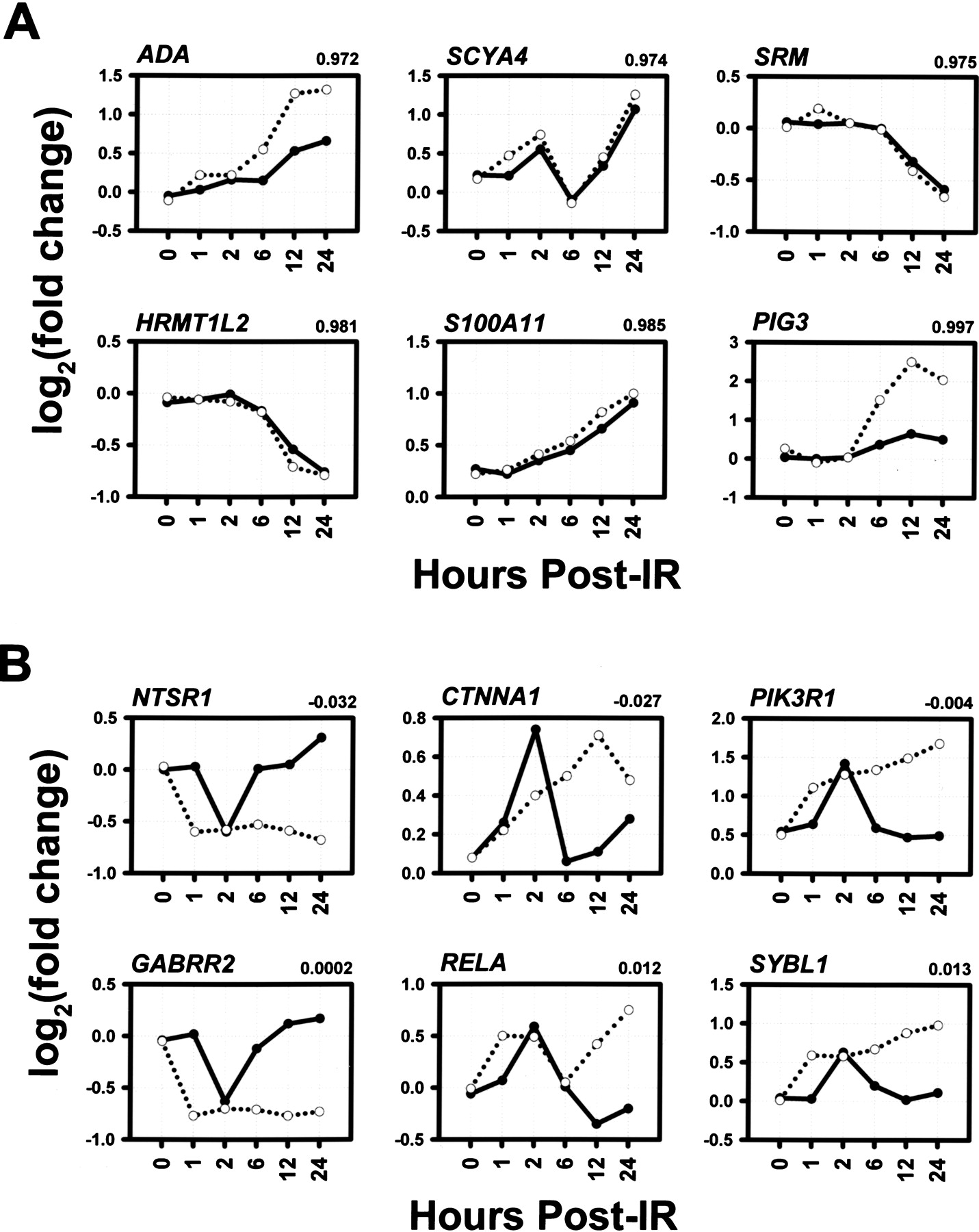Genes with the most similar (A) and the least similar (B) expression profiles between the 3 Gy (solid line) and 10 Gy (broken line) doses. For each gene, the correlation coefficients between the expression profiles are indicated at the top, right.