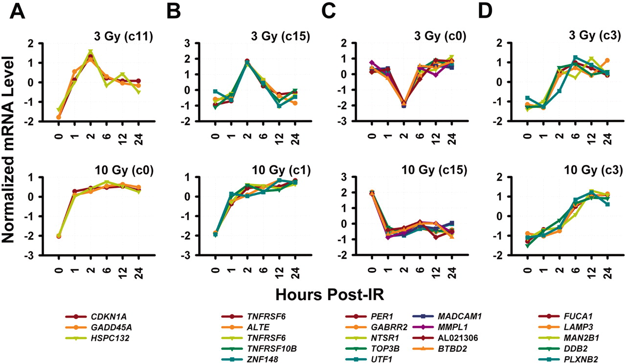Examples of sets of IR-responsive genes that belong to the same cluster, independent of IR dosage. Dose and cluster membership (see Fig. 4) are indicated to the right of each graph.
