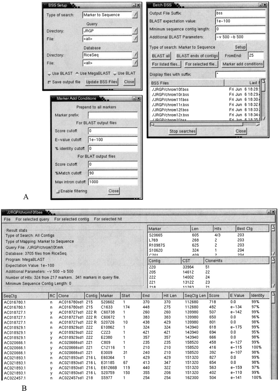 The windows that would be shown for a Marker→Sequence search using MegaBLAST in the Batch mode, which runs the search on all contigs. Values are entered in the Setup and Batch BSS windows and the search started. The results can be viewed in the BSS Report window. If the results are to be automatically added as markers using the Add as FPC Markers function, the Marker Add Conditions may first be altered.