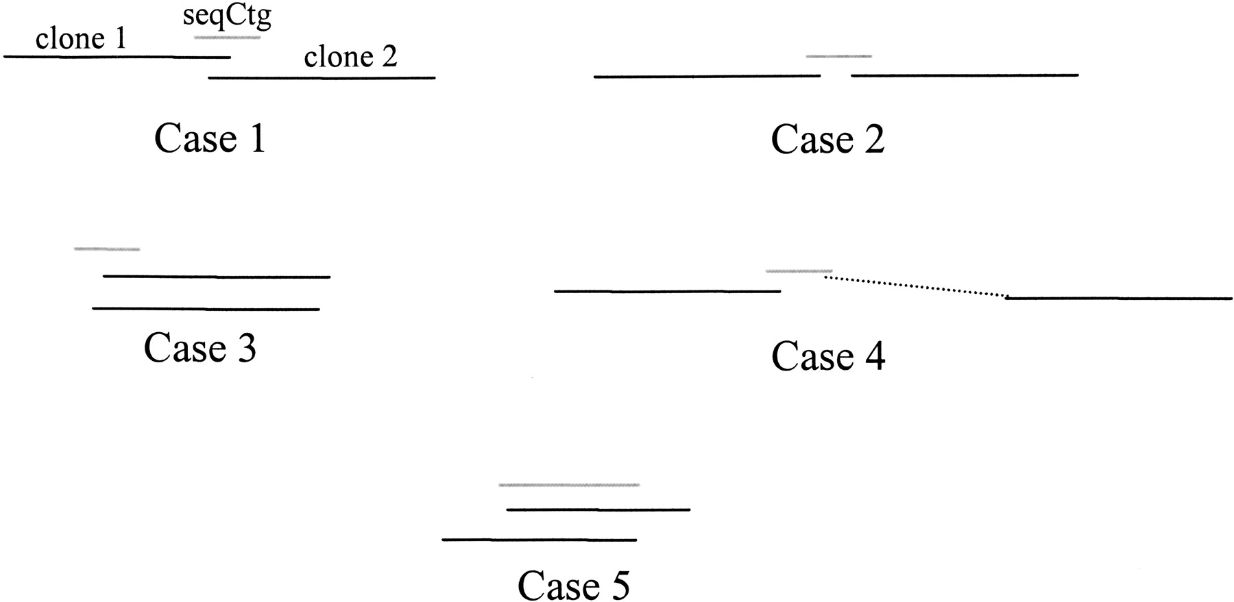 The five different types of pairs. Case 1 pairs consist of two overlapping clones, with the exact amount of overlap identified by the seqCtg. Case 2 clones have a gap between them; they are bridged by a seqCtg. In Case 3, the two clones cover a similar area. Case 4 pairs result from false positive hits. Case 5 pairs result from two small clones hitting on opposite ends of a long seqCtg; note this is similar to Case 1, but a large seqCtg may result in a large overlap.