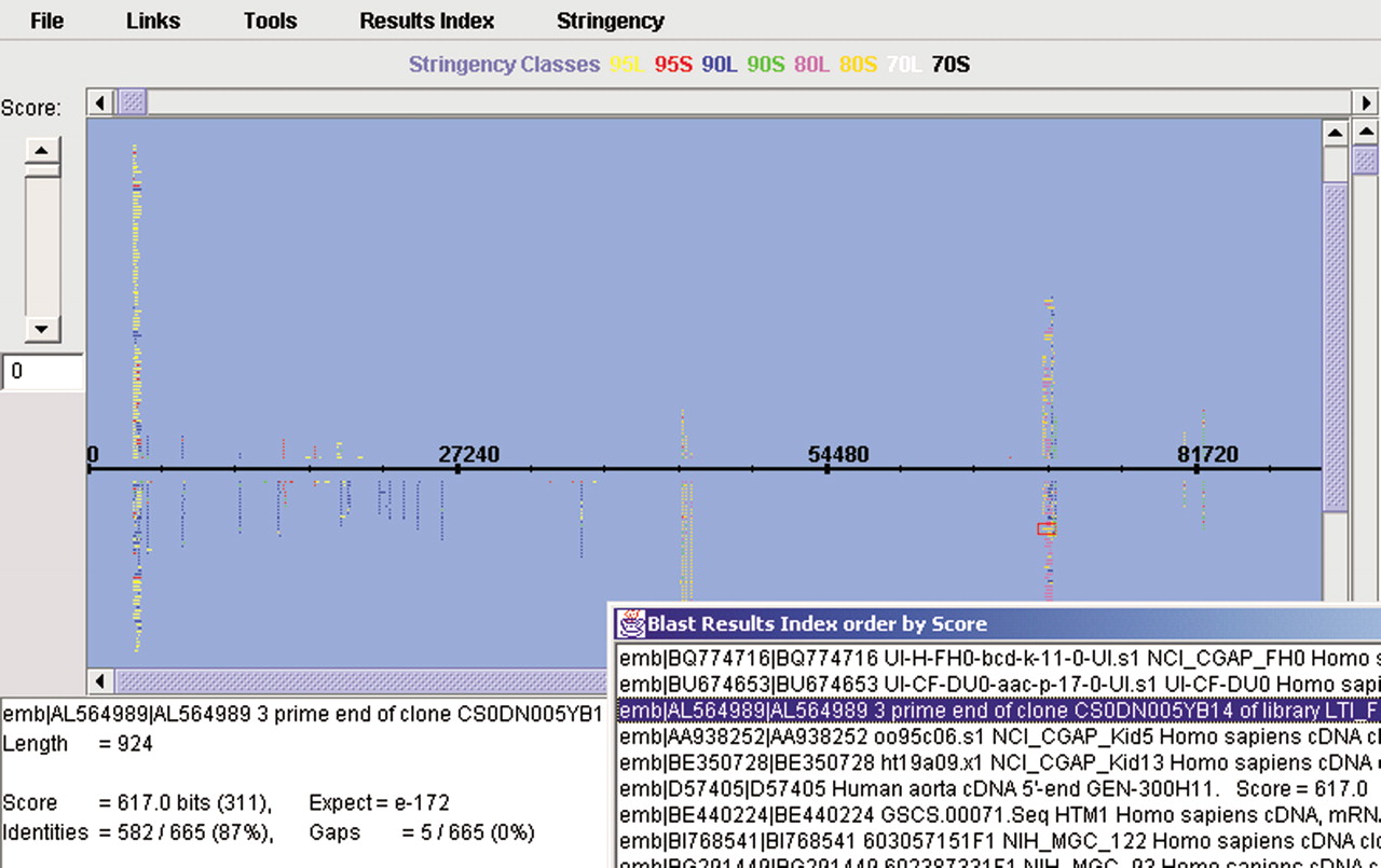 BLAST Display. The BLAST Display shows a summary of all the BLAST hits. The display can be scrolled and zoomed. An index of all of the hits can be displayed optionally—as shown—which is linked to the main display. The slider on the left of the display is used to screen the BLAST hits on minimum score value. Window images are clipped for presentation purposes.