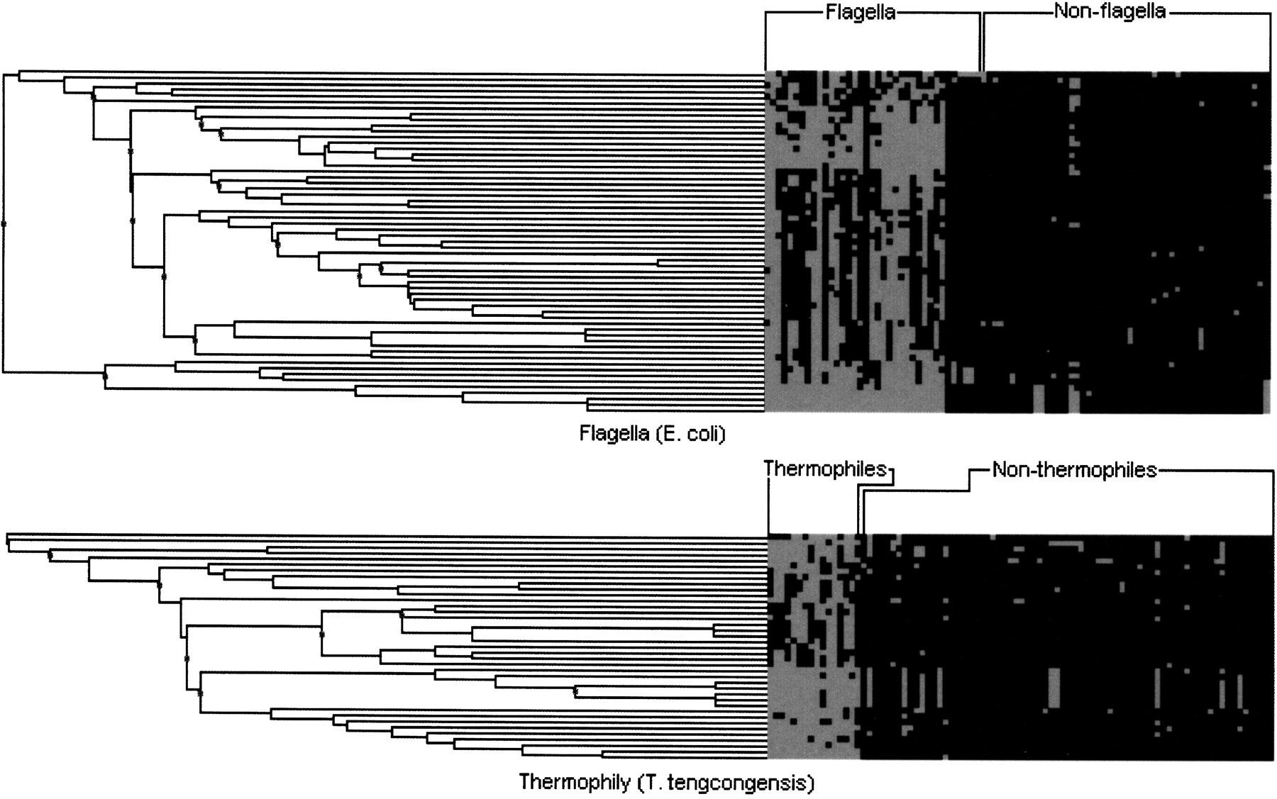 Hierarchical clustering (average-linkage) of the top proteins associated with flagella and thermophily (see Tables 2 and 4), on the basis of their phylogenetic profiles. Genomes are on the x-axis, and genes are on the y-axis. Gray coloring indicates the presence of a gene in a genome.