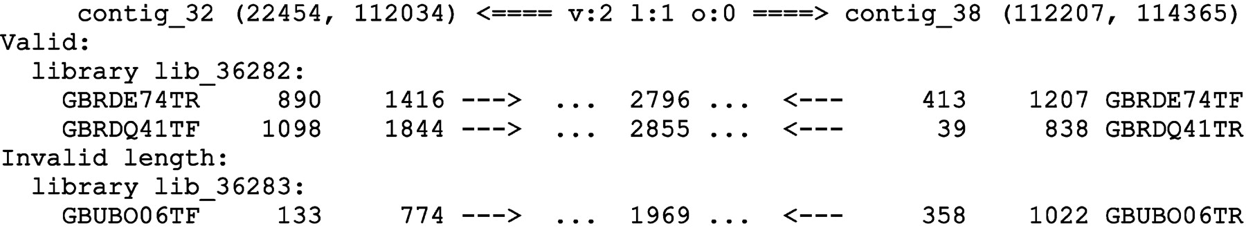 Detailed information produced by Bambus. Shown are two contigs connected by two valid links (v:2 in the header line), with 1 additional link whose length is outside the estimated range and therefore invalid (l:1). The contigs face away from each other, indicated by the arrows (“→”) in the header. Each pair of linked reads is shown on a separate line, with coordinates indicating the position of the read within its contig. For example, GBRDE74TR is mapped to positions 890-1416 of contig_32, and GBRDE74TF is mapped to positions 413-1207 of contig_38.